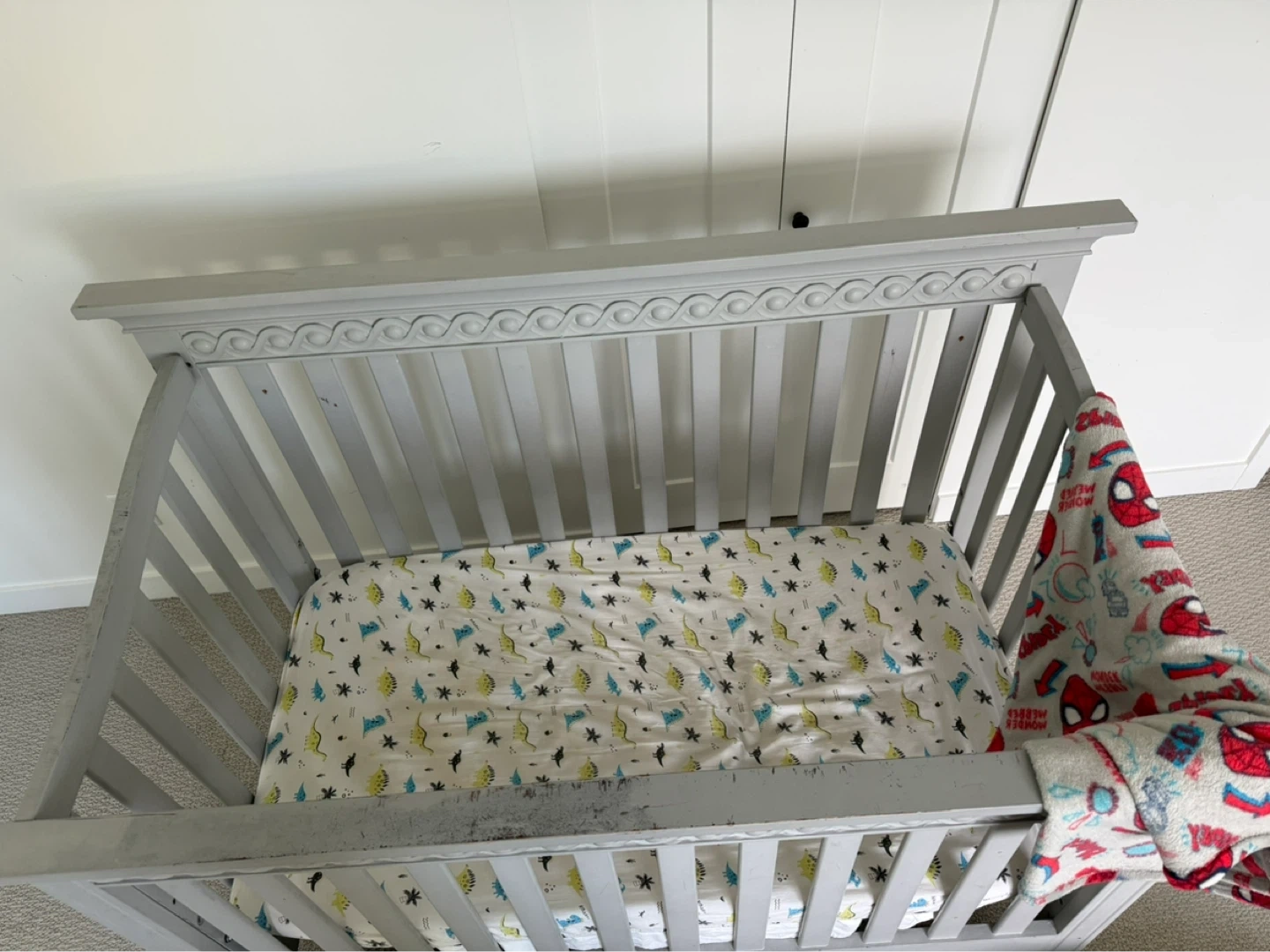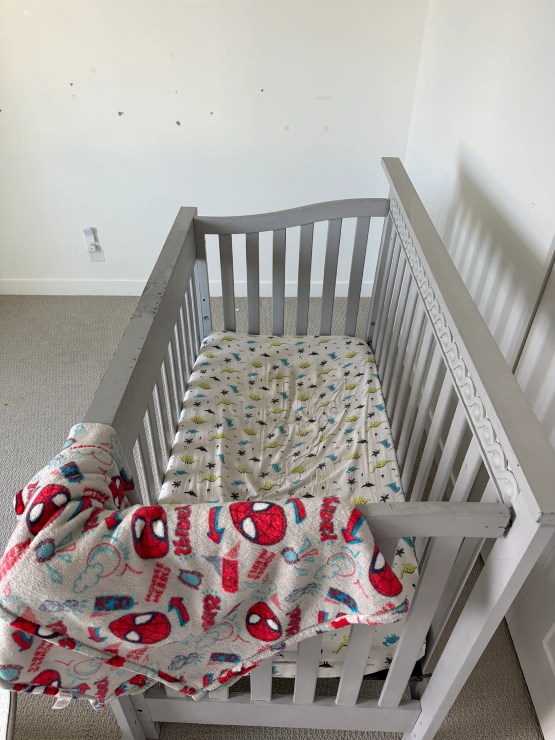 Grey convertible crib with ornate detailing. Converts from crib to todler bed with side rail ( one screw missing )