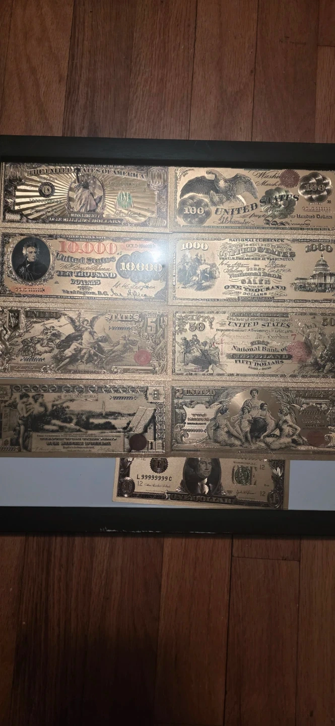 This is a collection of gold plated replicas of various United States currency bills. It includes designs for $10,000, $1,000, $50, and other denominations. These are novelty items and not actual currency. This is for decorating look
