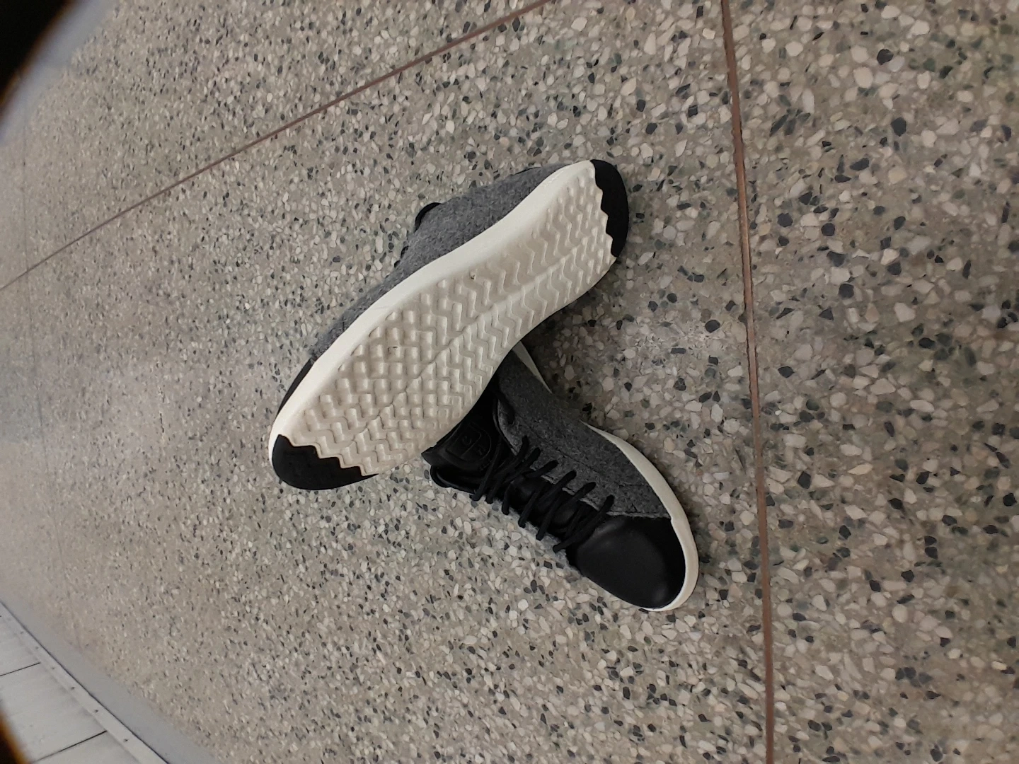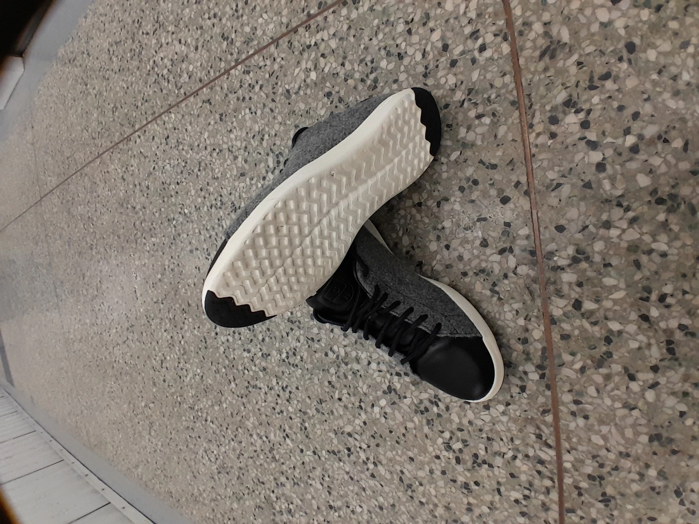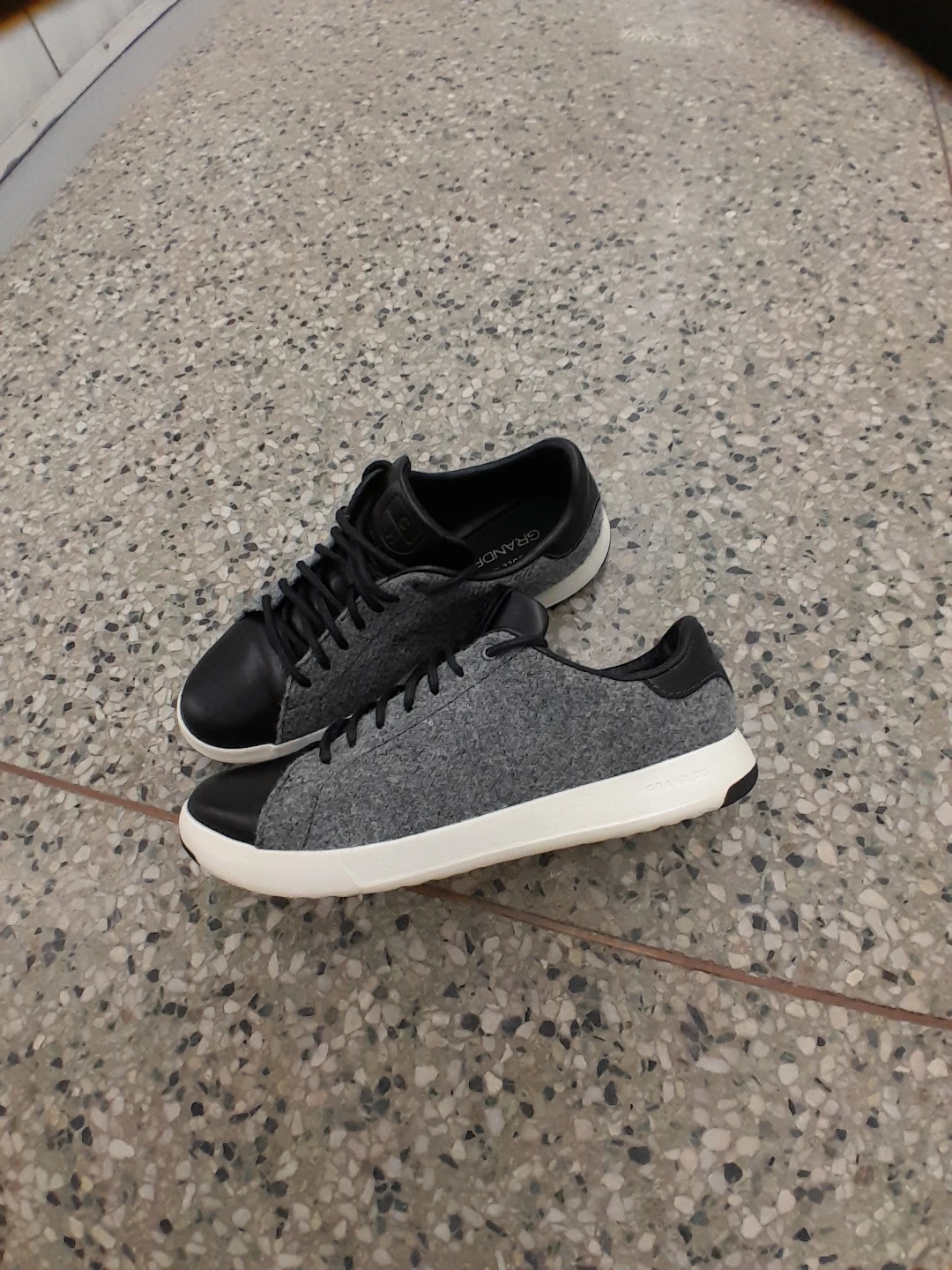 Cole Haan GrandPrø sneakers are crafted from a blend of grey felt and black leather. They feature a classic lace-up closure and a durable white sole. They're great for everyday wear! Men's Size 9.