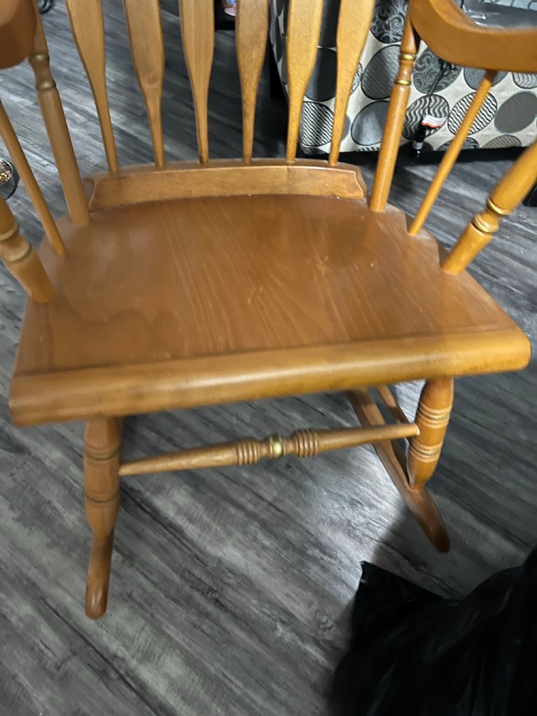 Comfortable wooden rocking chair. Features a carved floral design on the backrest. Solid wood construction. Suitable for living room or bedroom.