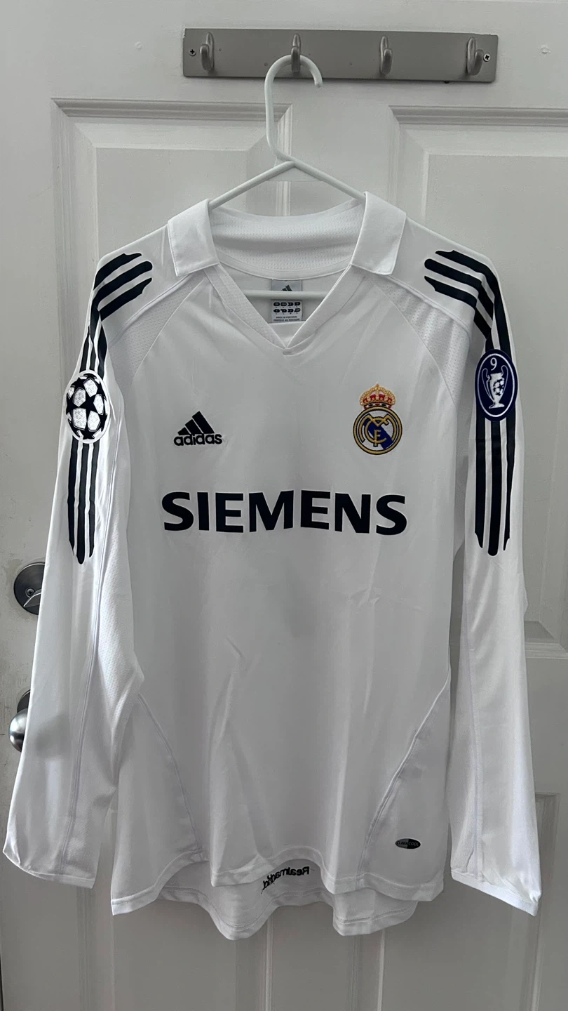 White long-sleeve Adidas Real Madrid jersey with Zidane #5 printed on the back. Features the Siemens sponsor logo on the front. Made from breathable material.