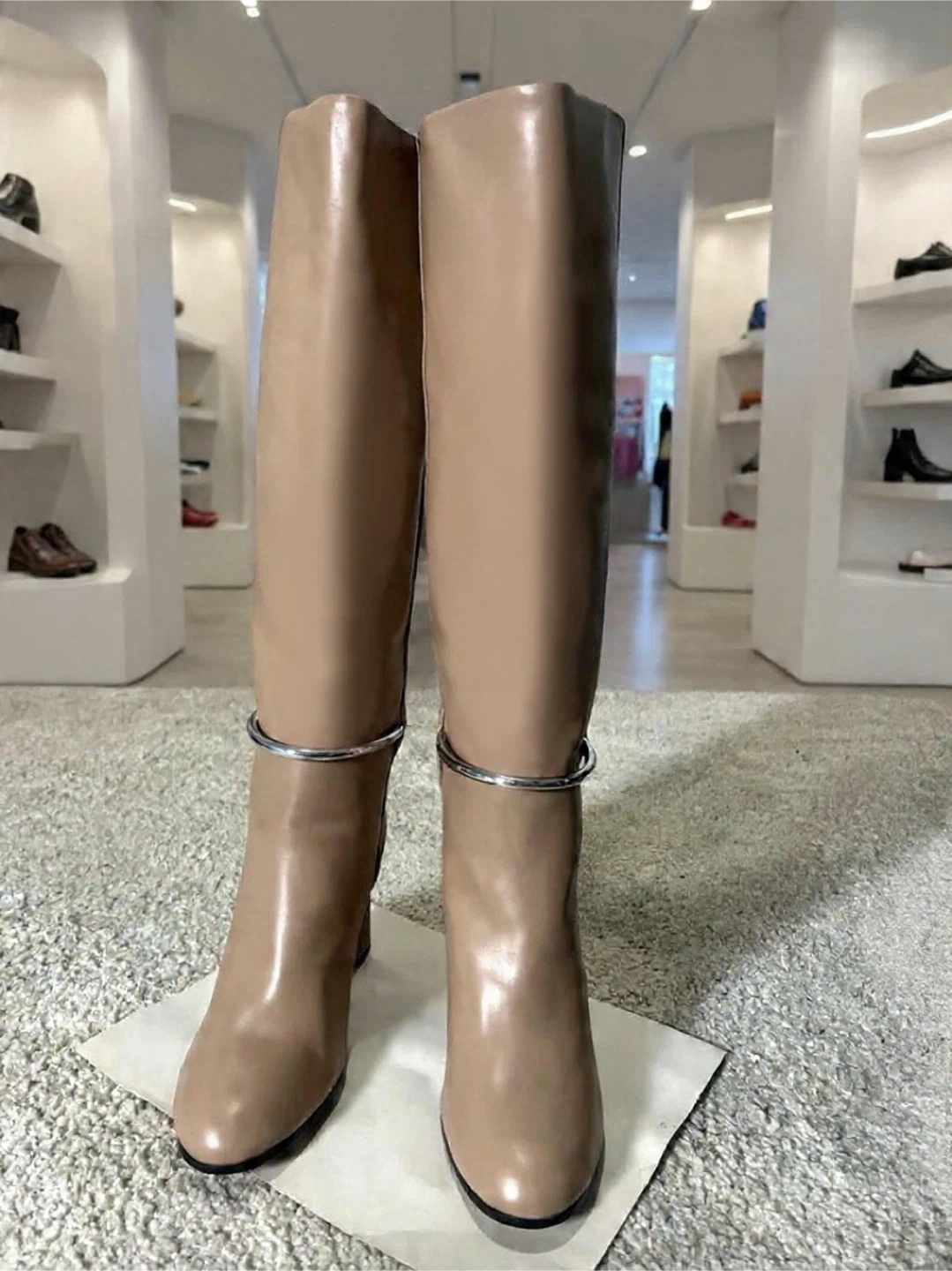 These stylish nude leather tall boots feature a sleek design with a subtle silver accent ring around the ankle. Perfect for adding a touch of sophistication to any outfit. The boots are made from genuine leather.