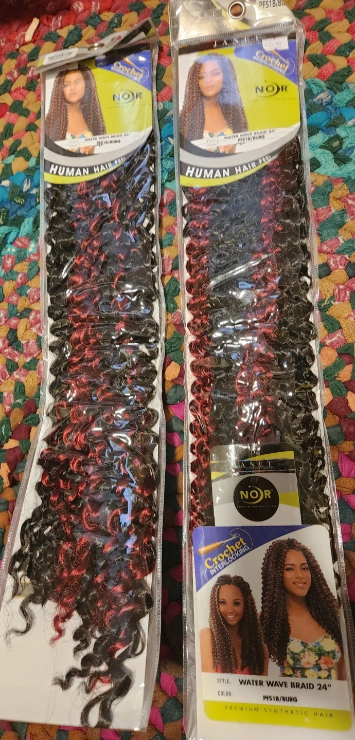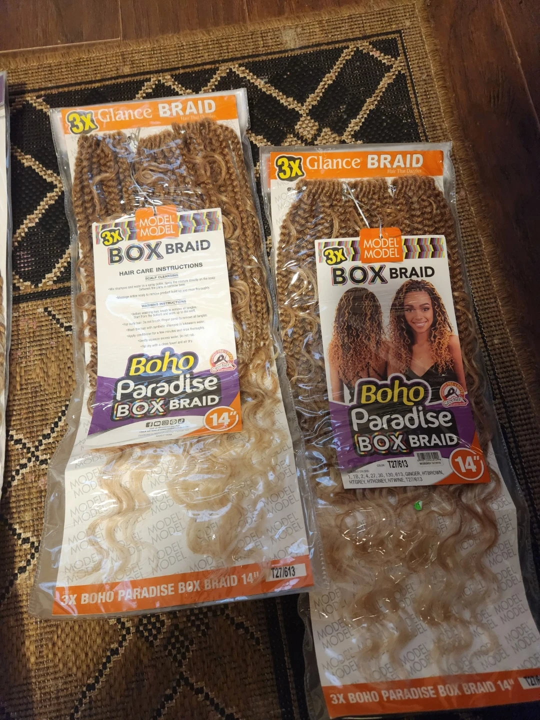 Selling two packs of 3X Boho Paradise Box Braid, one 14" and one 22". Also includes two packs of Crochet Water Wave Braid, 24". Perfect for various protective hairstyles!
