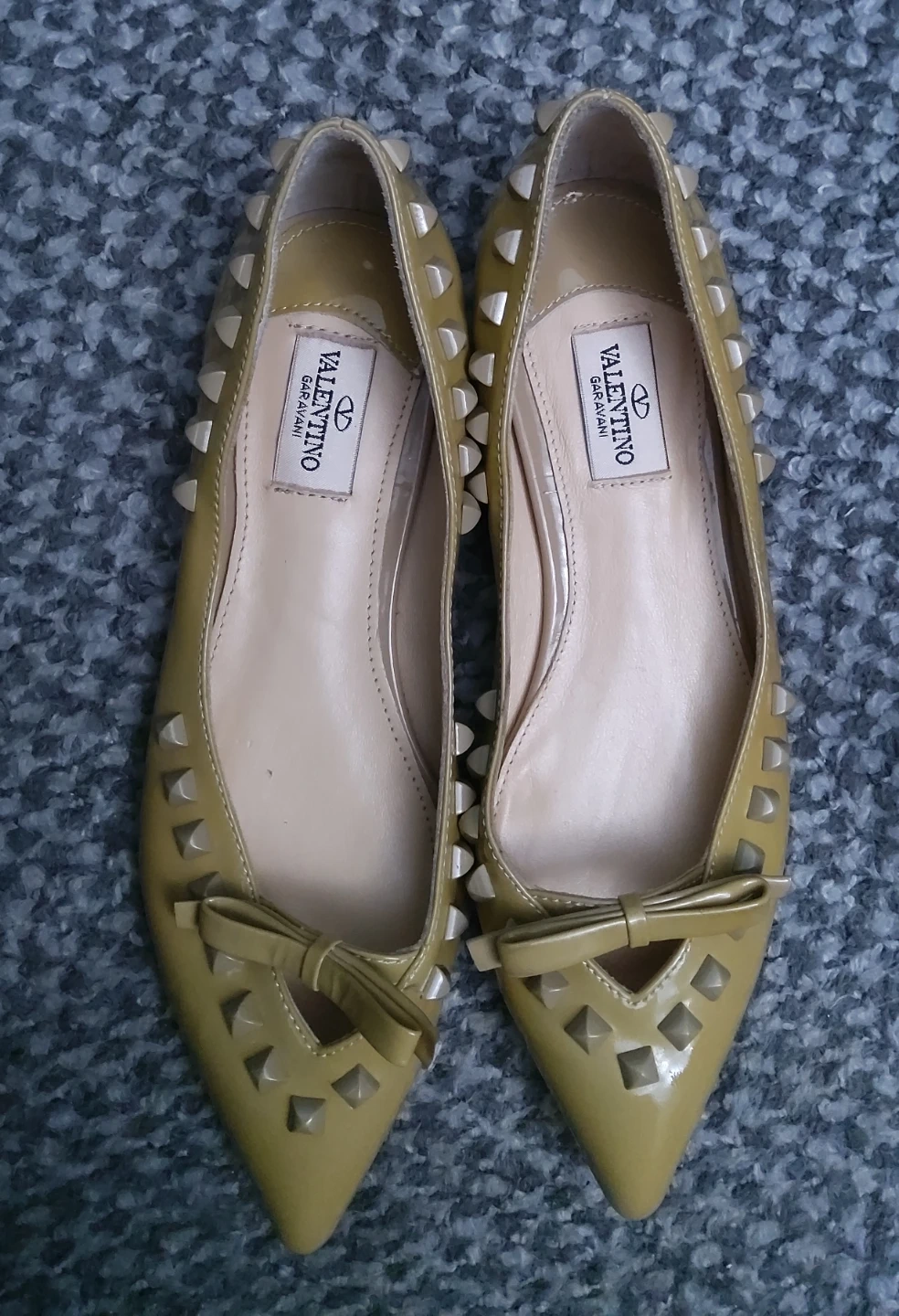 Valentino Garavani patent leather rockstud ballet flats. They're embellished with signature pyramid studs and feature a cute bow detail at the toe. SIZE 36 = US 6