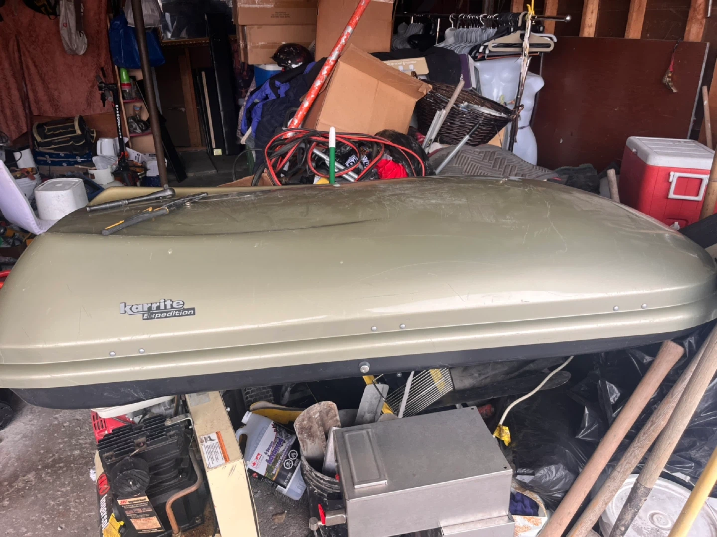 This is a Karrite Expedition cargo box. It's a light beige colour and appears to be made of durable plastic. It's spacious and ready for your next road trip!