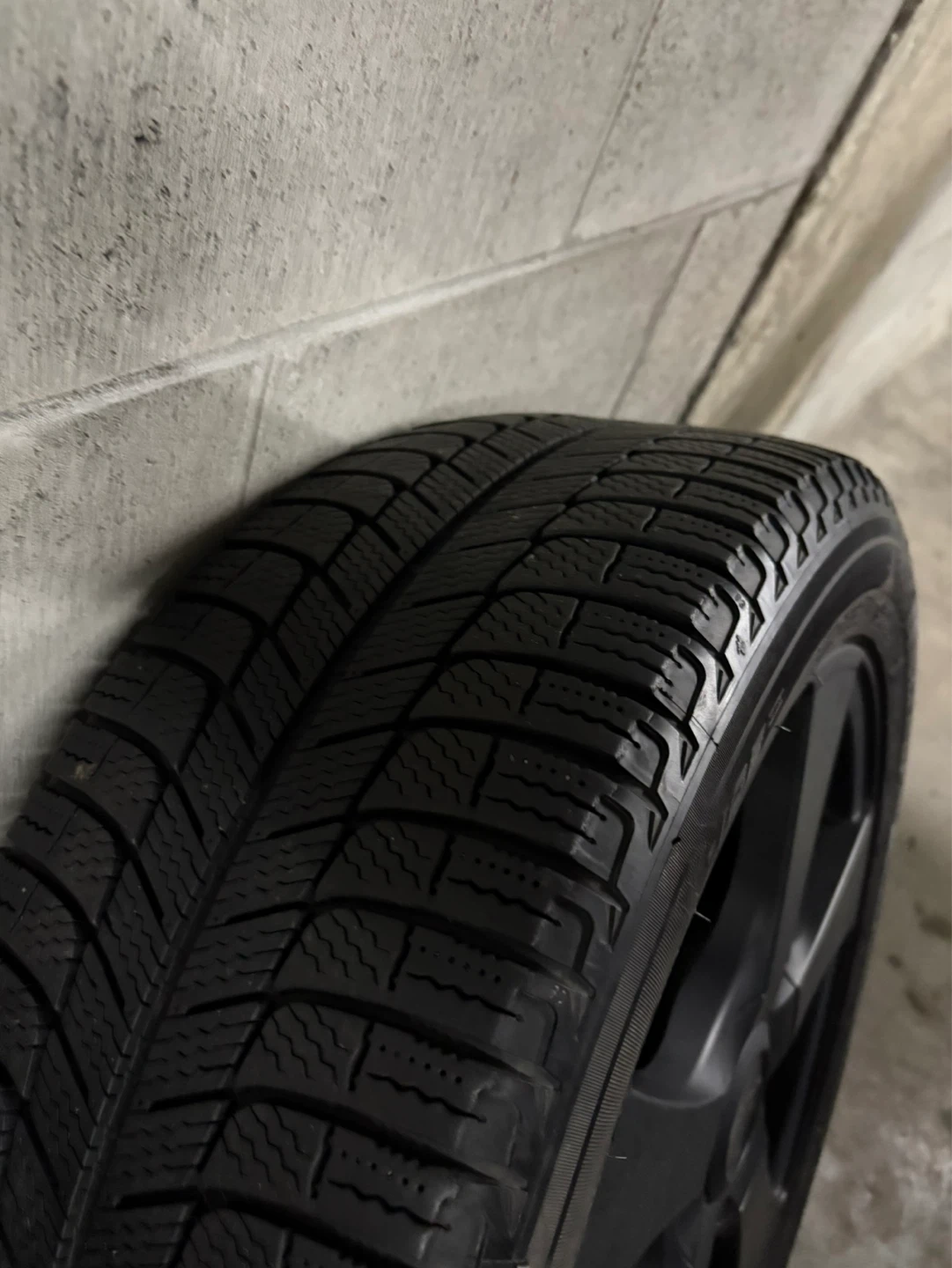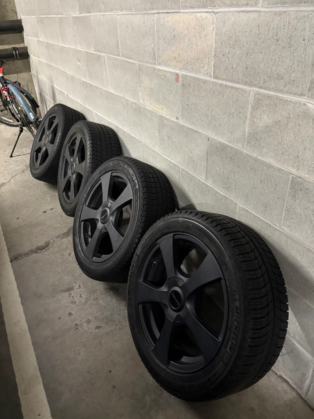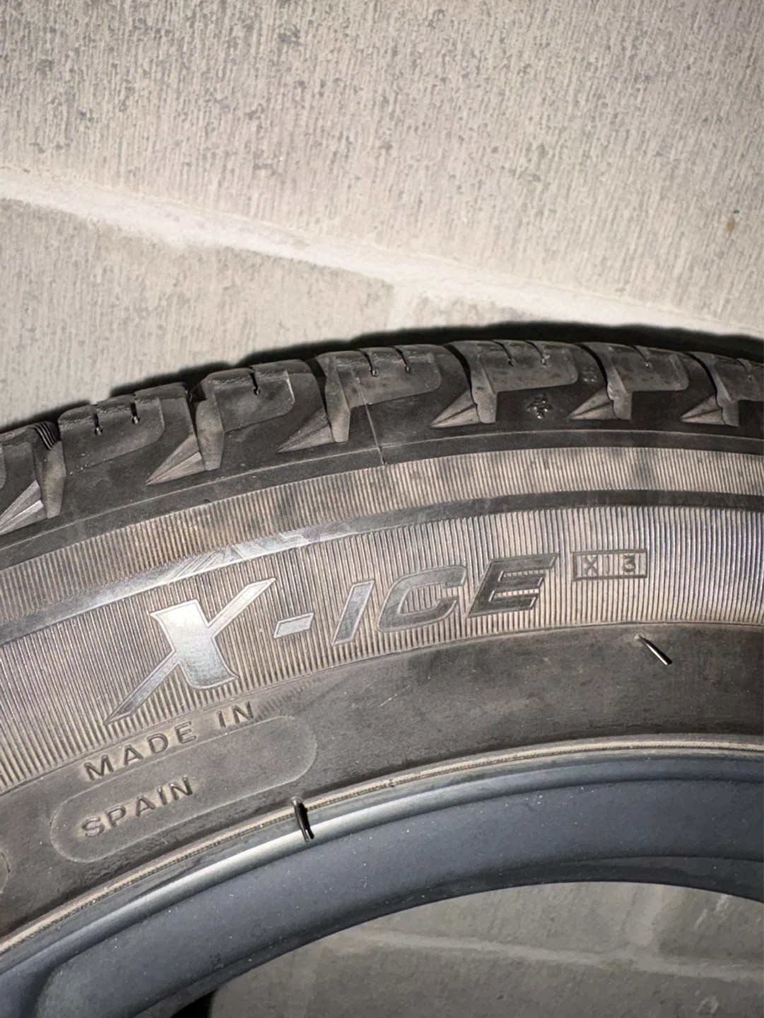 Set of four Michelin X-Ice winter tires, made in Spain. These are quality tires for Canadian winters. They come mounted on matte black rims.