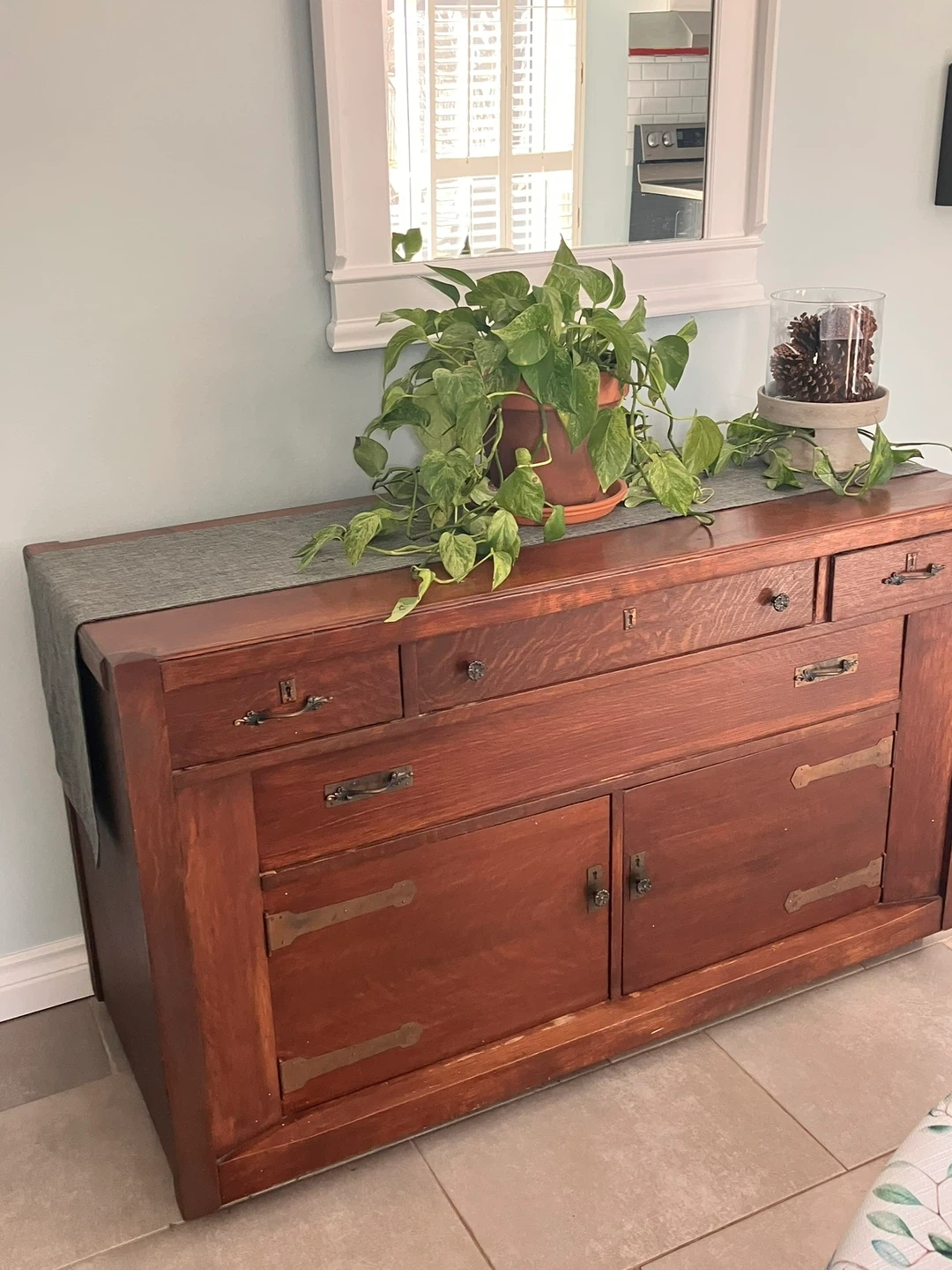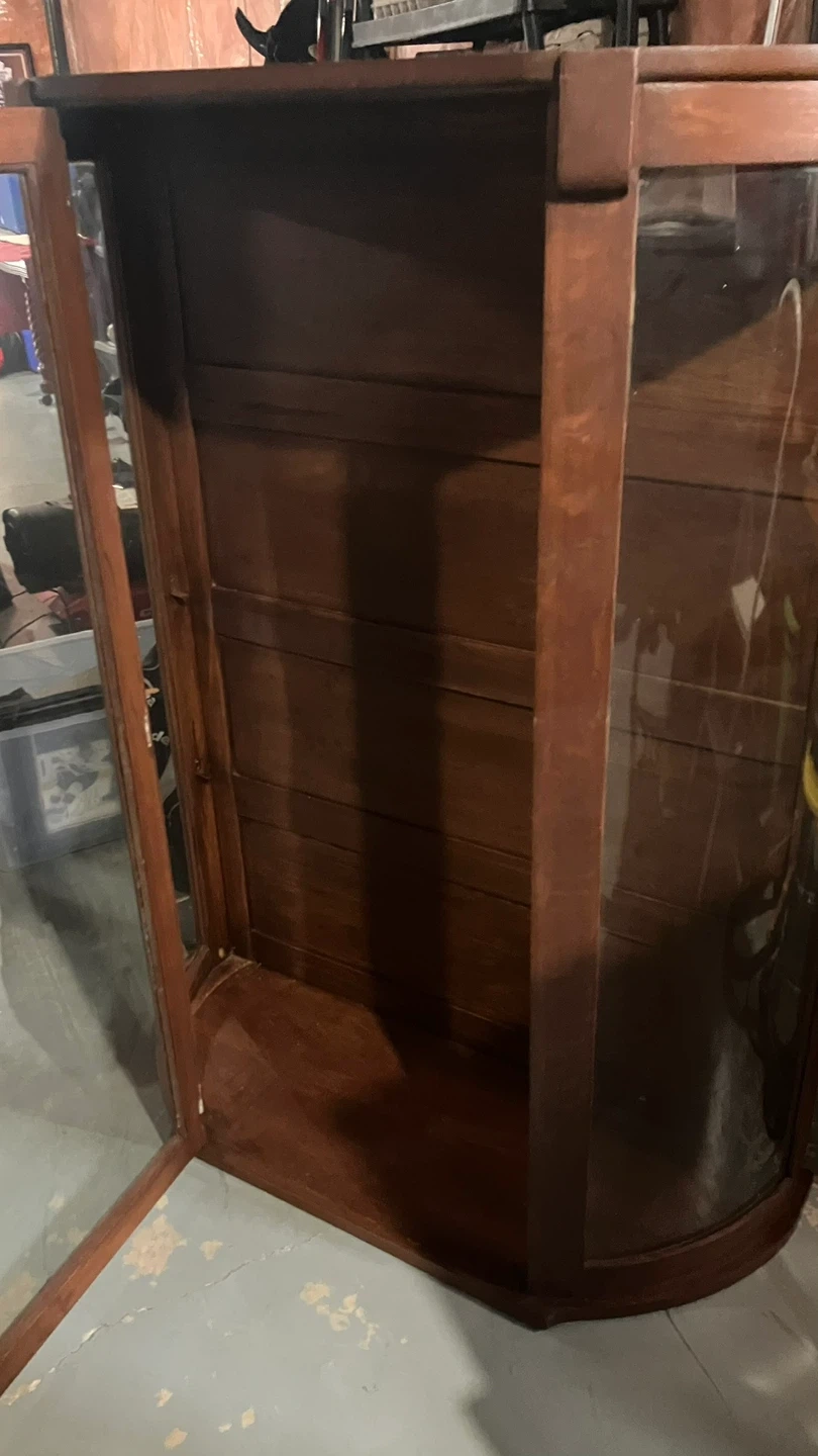 This is a beautiful wooden display cabinet with glass doors. It features multiple shelves for displaying items. The wood has a rich, dark finish. It's a lovely piece for a living room or dining area! Can be separate or glass hutch sits on top of sideboard