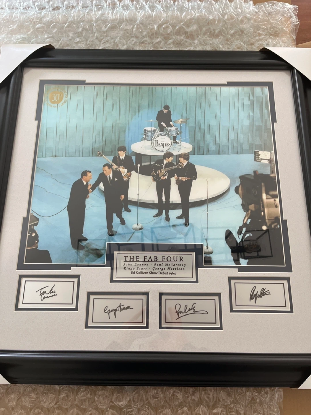 The Beatles' Ed Sullivan Show debut in 1964. Features images of the band and "The Fab Four" title with the names of John Lennon, Paul McCartney, Ringo Starr, and George Harrison.