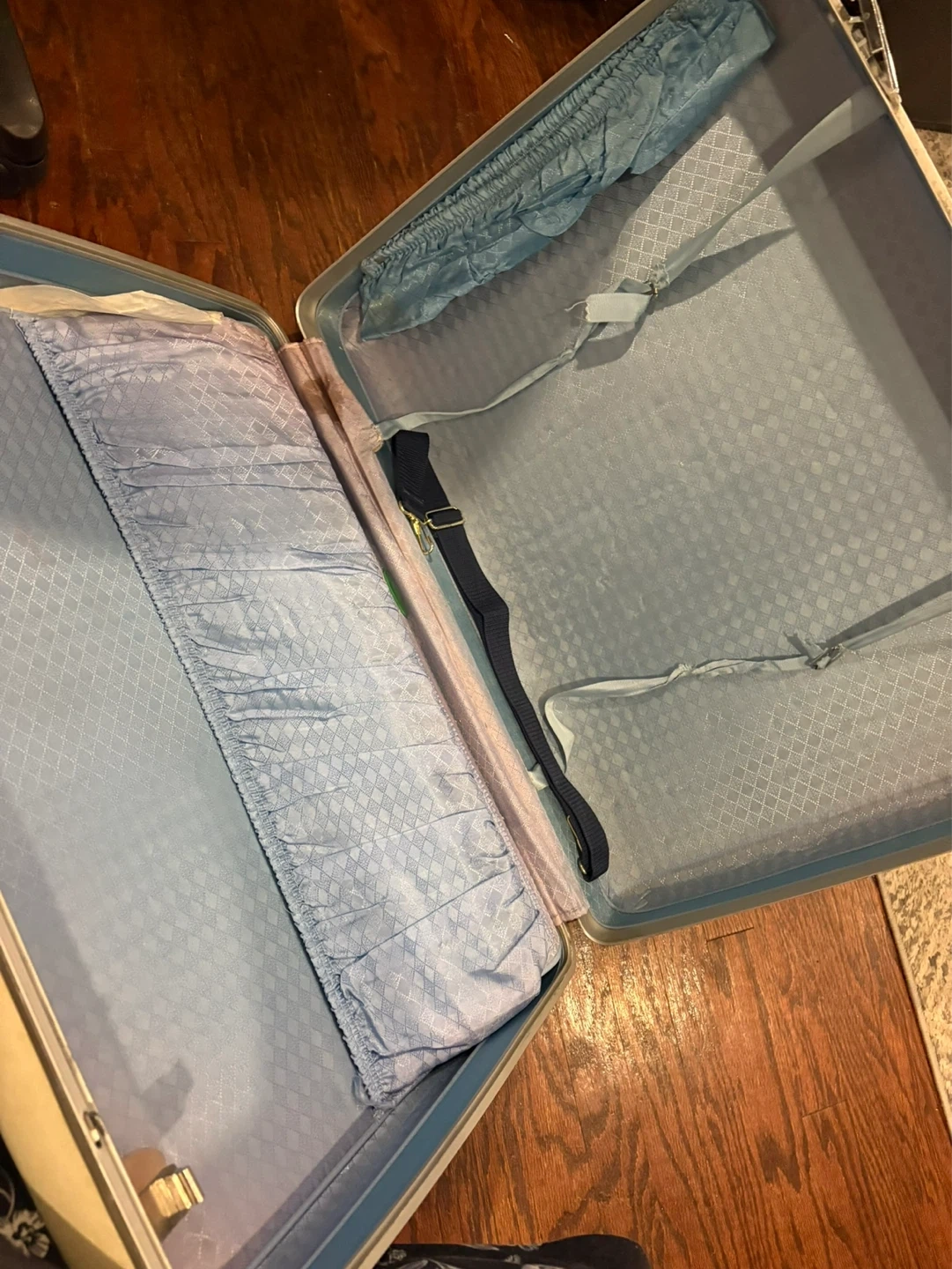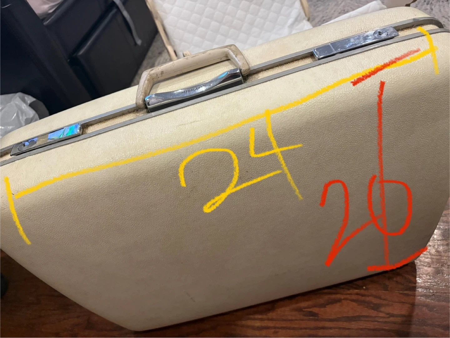 Vintage Samsonite hardside suitcase. Measures approximately 24 inches long and 20 inches high. It's a classic cream colour with silver latches and a sturdy handle. Interior includes securing straps.