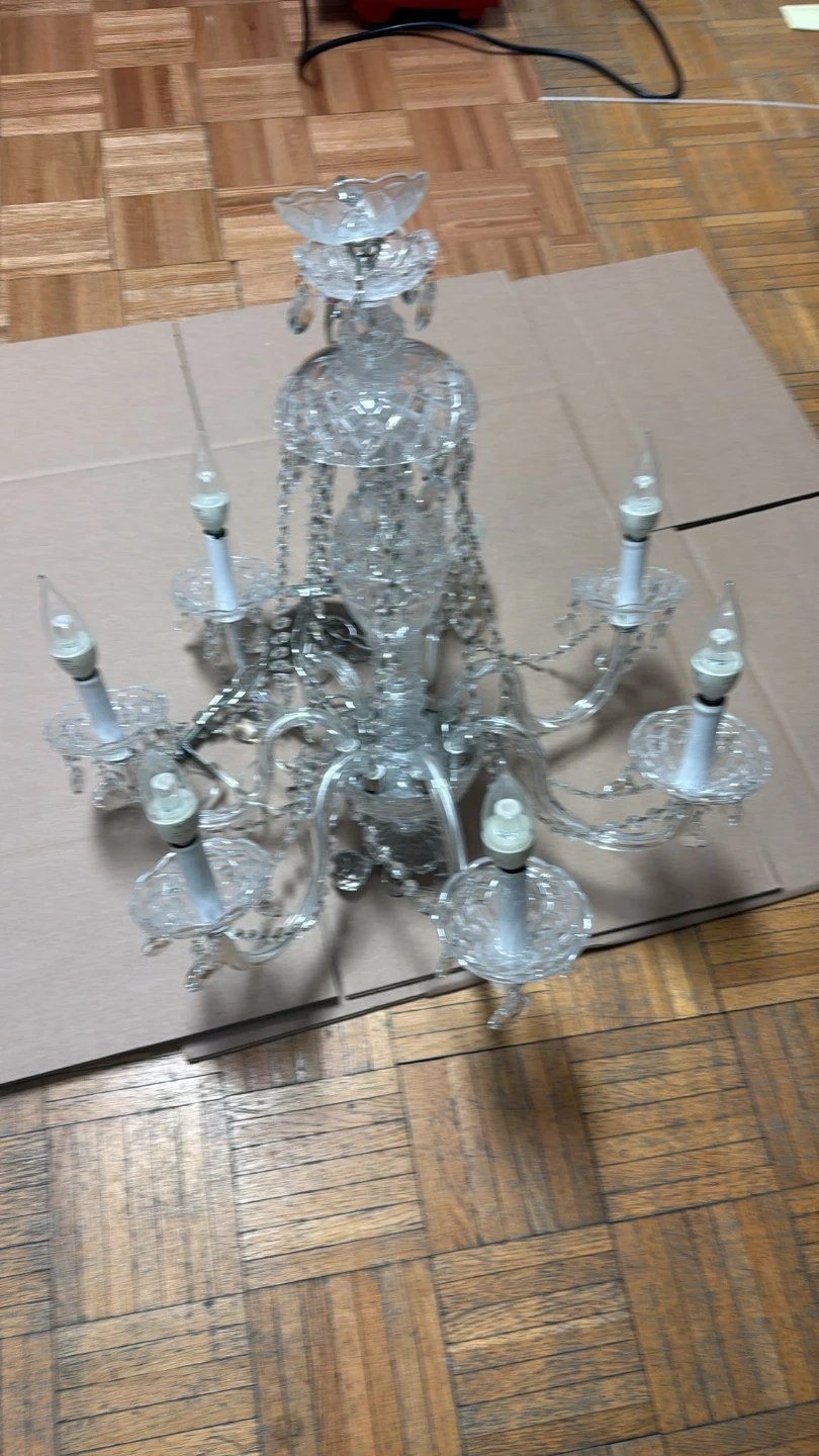 Gorgeous crystal chandelier-style light fixture. It features multiple arms with candle-style bulbs and sparkling crystal accents throughout! Adds elegant ambiance to any room.