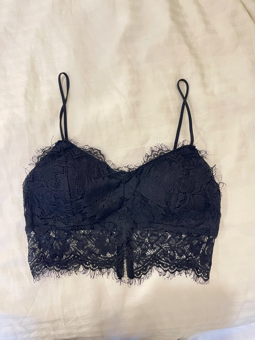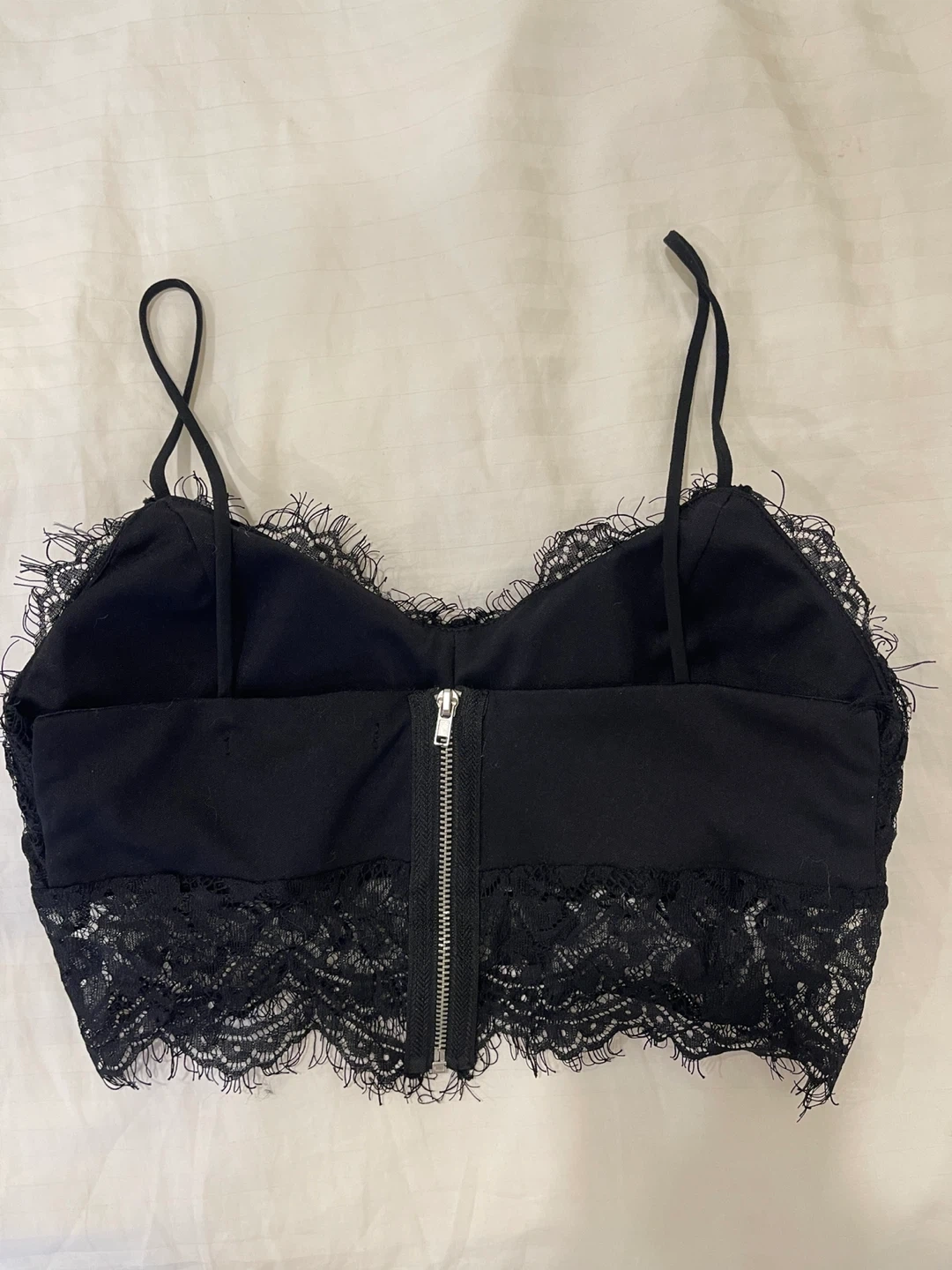 This is a black lace bralette. It's made with a soft lace overlay and adjustable spaghetti straps. Features a zippered back for easy wear. Lace material.