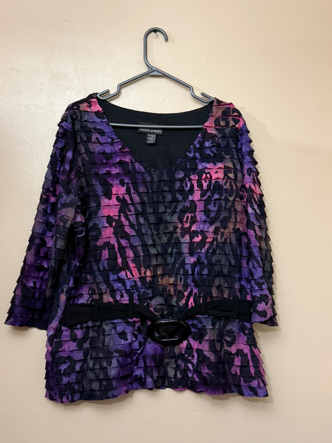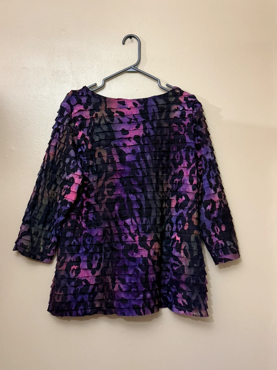 This pre-owned colourful blouse is a size 14 and features a unique layered design with an eye-catching animal print in shades of purple, pink, and black. The blouse has 3/4 sleeves and a decorative belt at the waist, making it a stylish addition to any wardrobe. The blouse is in good condition.