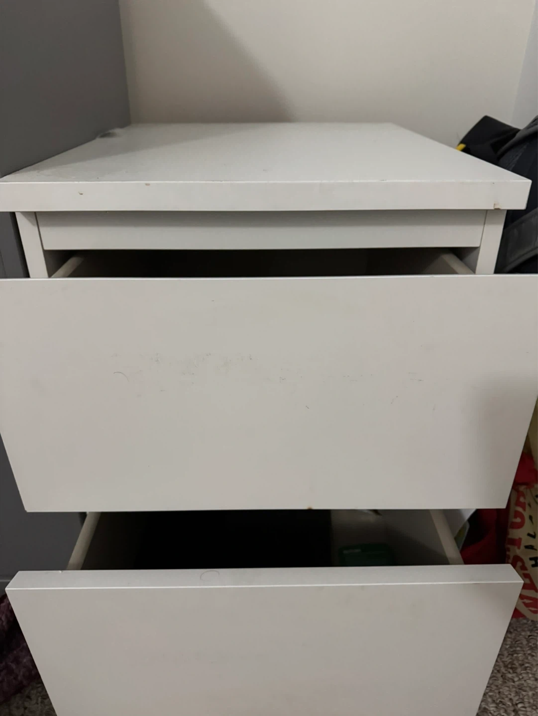This white dresser has two drawers. It's made of particleboard with a laminate finish. Perfect for storing clothes or other items.