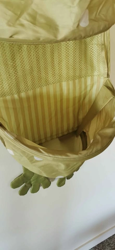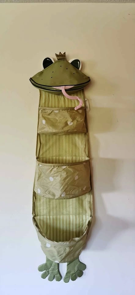 This unique piece is the IKEA FABLER GRODA frog wall hanging storage organizer. Part of a vintage kids' collection, this whimsical "frog prince" (complete with a gold crown and pink tongue) was designed to hold toys, stuffed animals, or even diaper supplies. Made from durable, washable 100% polyester. Features three large fabric pockets with white polka dots and two mesh "peek-a-boo" sections that allow kids to see what's inside. It stands approximately 53 inches (135 cm) tall and 14 inches (35 cm) wide. Attaches to the wall or a door using a simple loop or velcro strap at the back.
