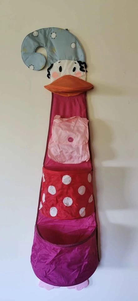 This playful wall-mounted storage unit is the IKEA Fabler ANKA Hanging Organizer. Designed for children's rooms, it features a whimsical duck character with three distinct storage areas to help keep toys and accessories organized. It measures approximately 35 cm wide by 140 cm high (approx. 13.8" x 55"). Includes a duck head at the top with a blue "nightcap" featuring stars and a moon. Features three pockets: a pink top pocket with a button closure, a red middle pocket with white polka dots, and a large purple bottom pocket. It typically hangs using loops designed to open if a child attempts to climb it.