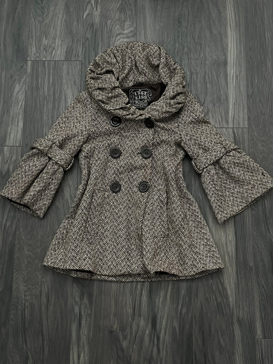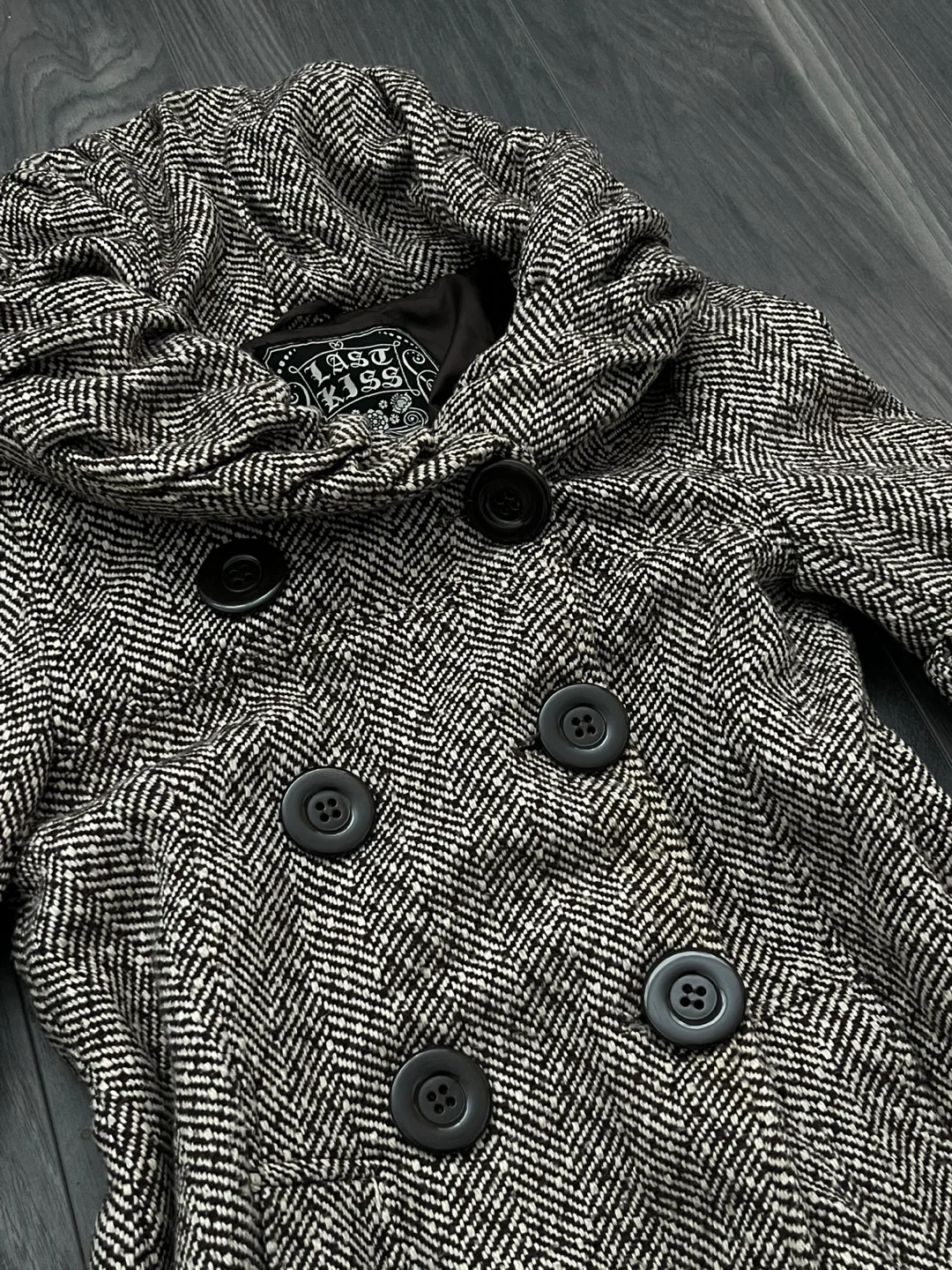 Last Kiss peacoat with tweed ruffle collar. Features gorgeous button designs and bell shaped sleeves. Y2K piece. No damage.