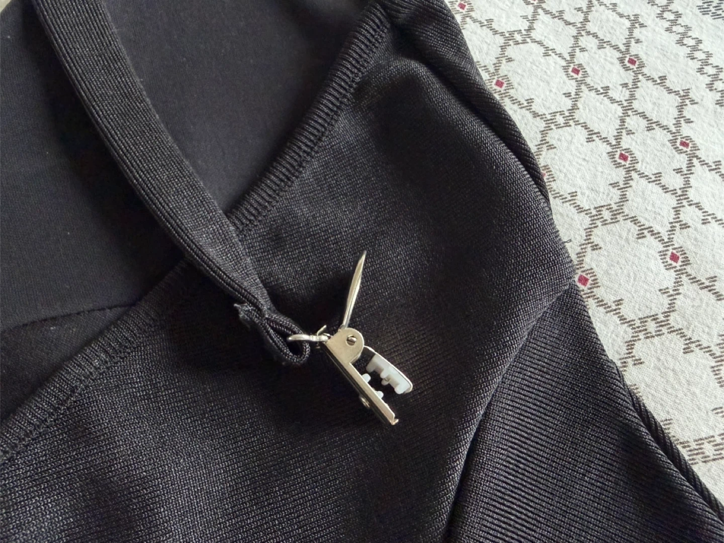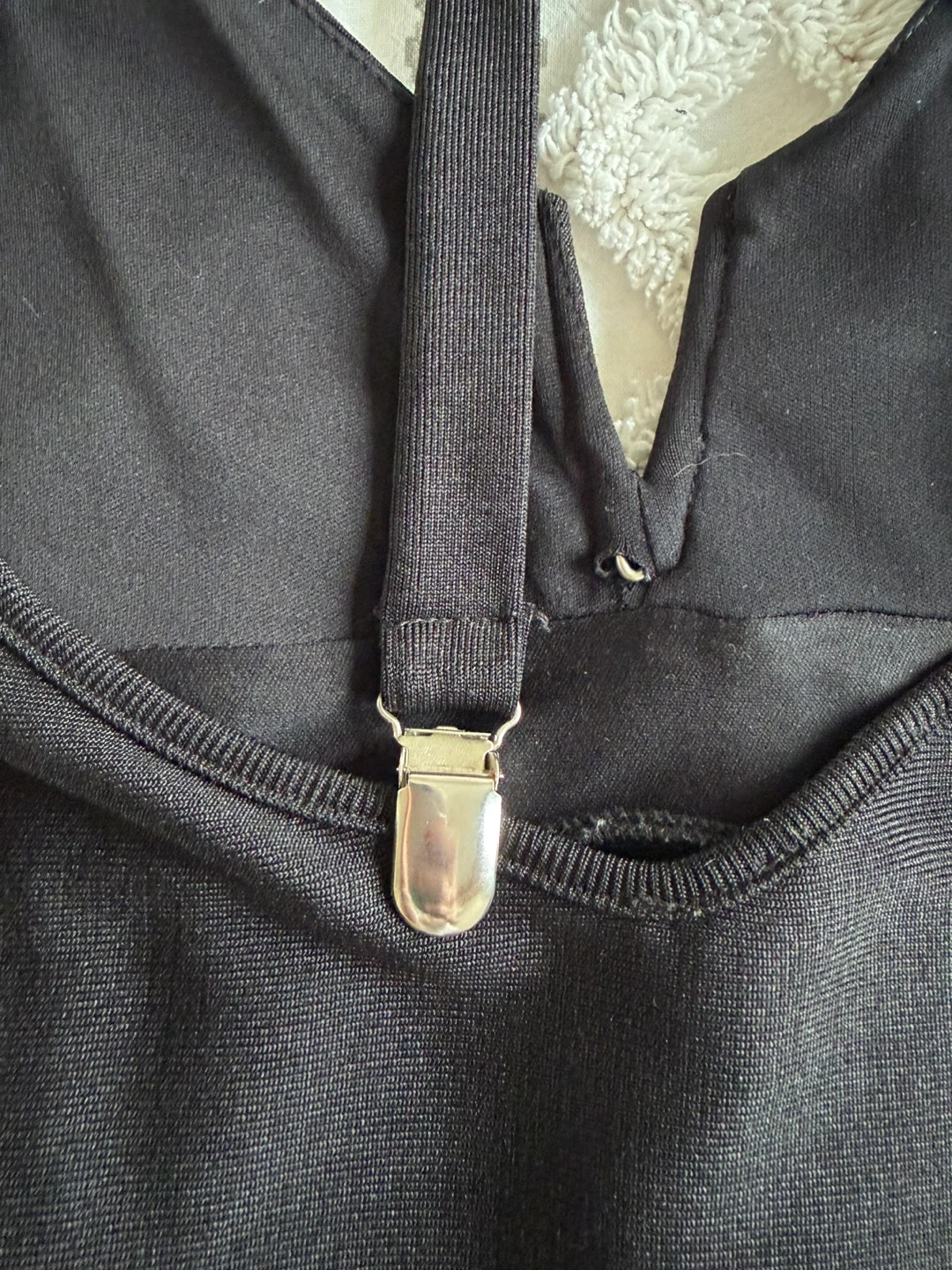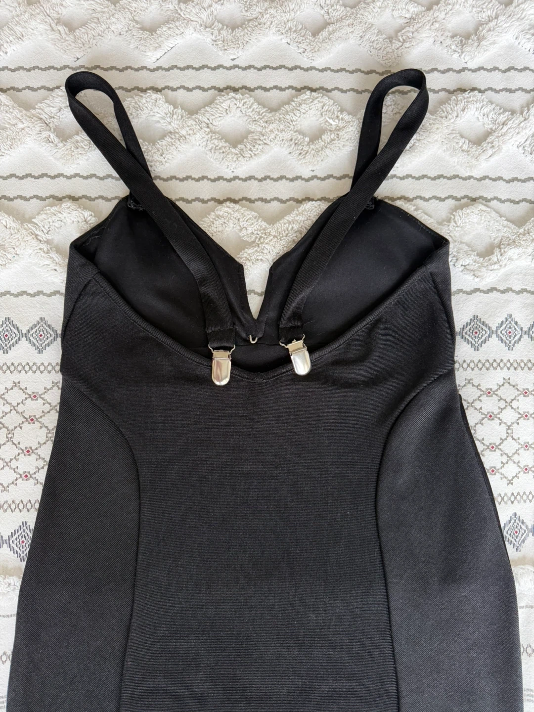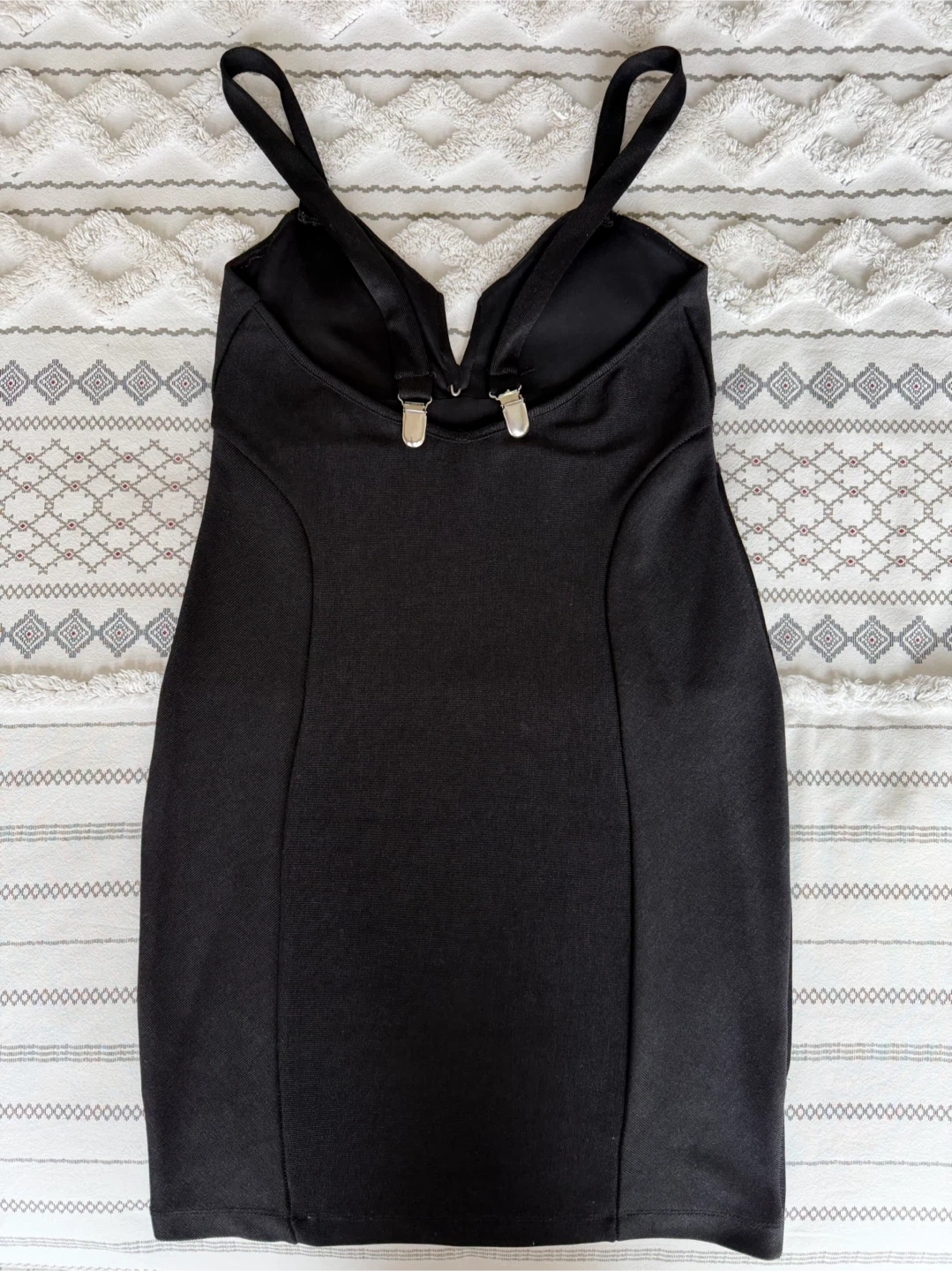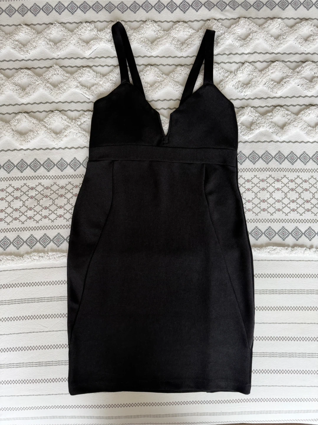 This black mini dress features a flattering V-neckline and suspender-style adjustable straps. It's made of a slightly stretchy, textured fabric. Size 4.