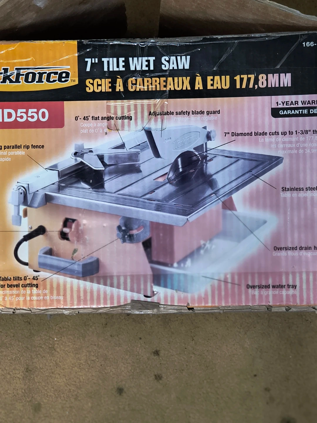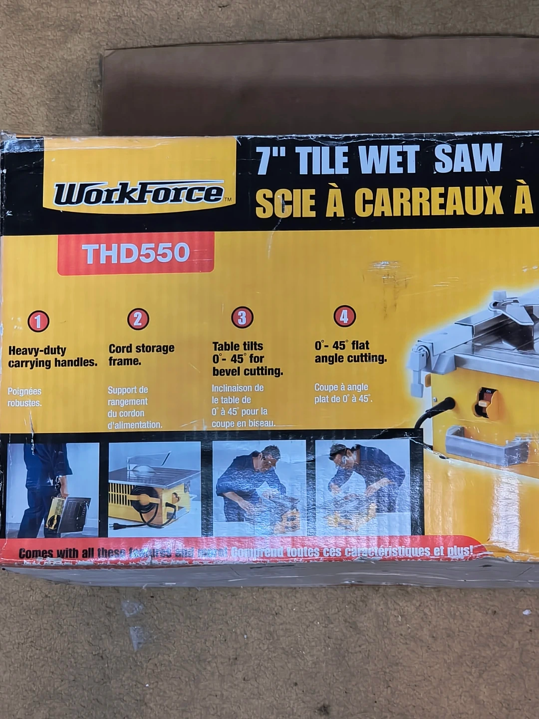 Workforce THD550 7" tile wet saw for 0-45 degree bevel cutting. Features heavy-duty carrying handles and cord storage. Table tilts 0-45 degrees for bevel cuts and 0-45 degree flat angle cutting.