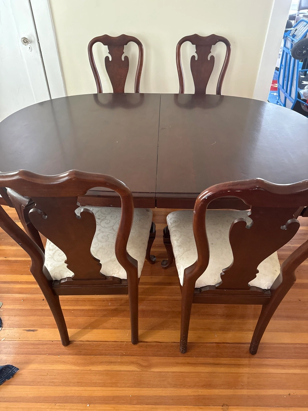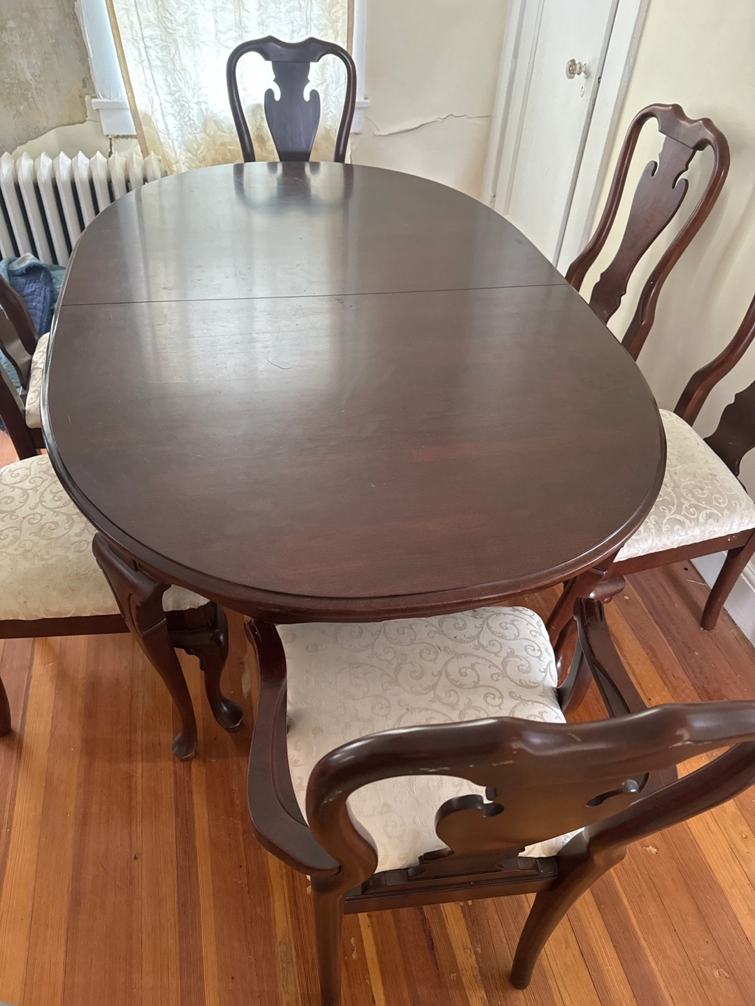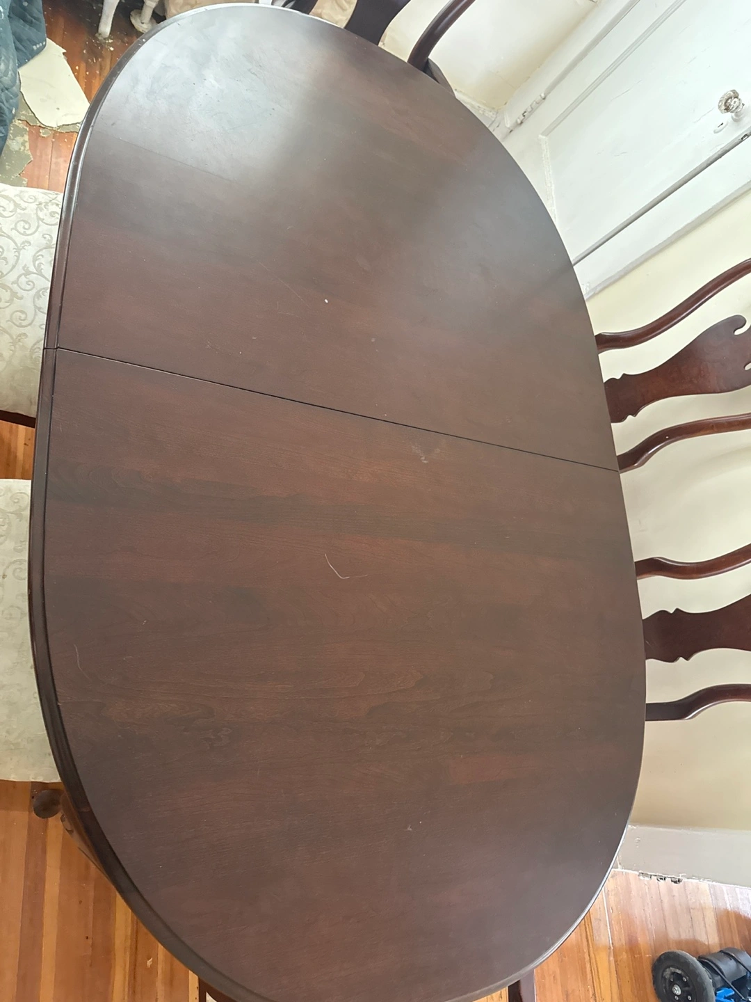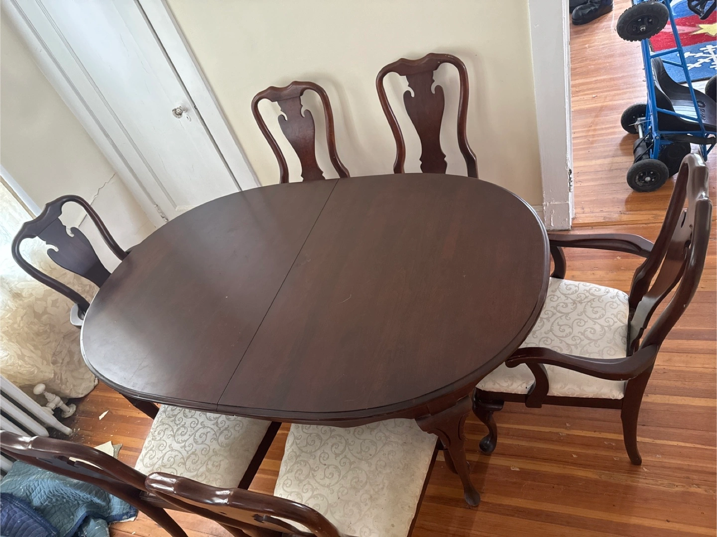 Dark wood oval dining table set. Includes six upholstered chairs. Chairs have a light damask pattern. Table has a leaf for extension.