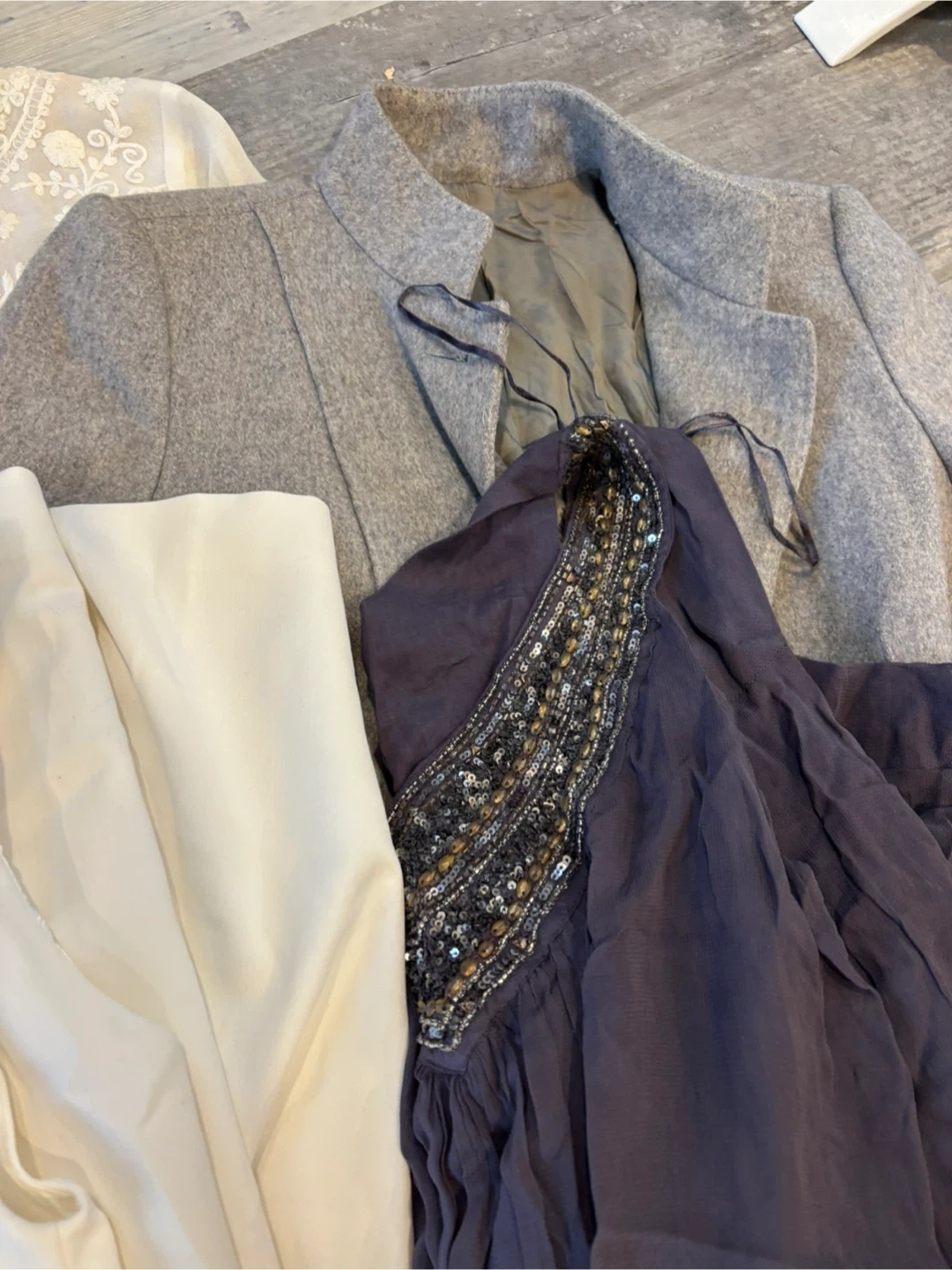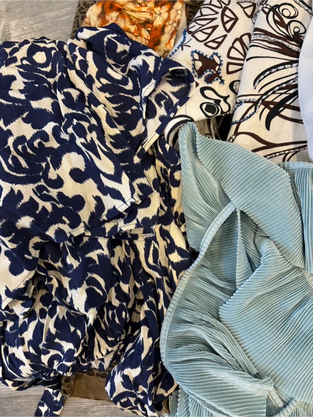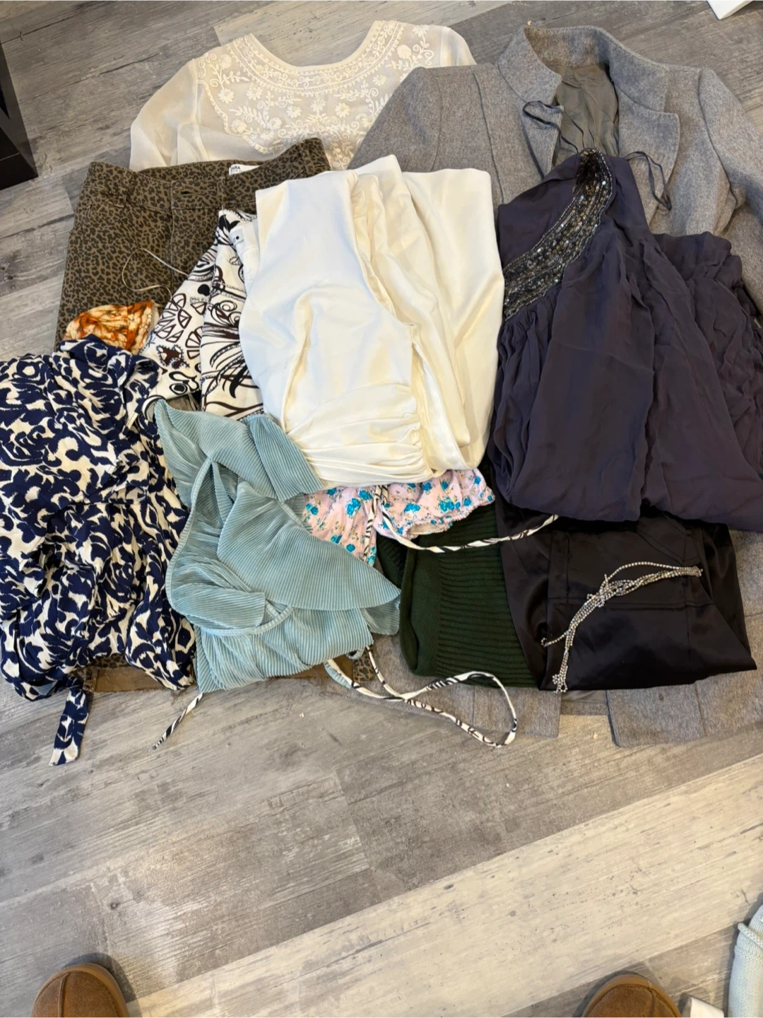 A collection of women's clothing items including a grey coat , patterned blouses, and a white top. Material composition varies by piece. This bundle offers a variety of styles for casual and semi-formal wear.