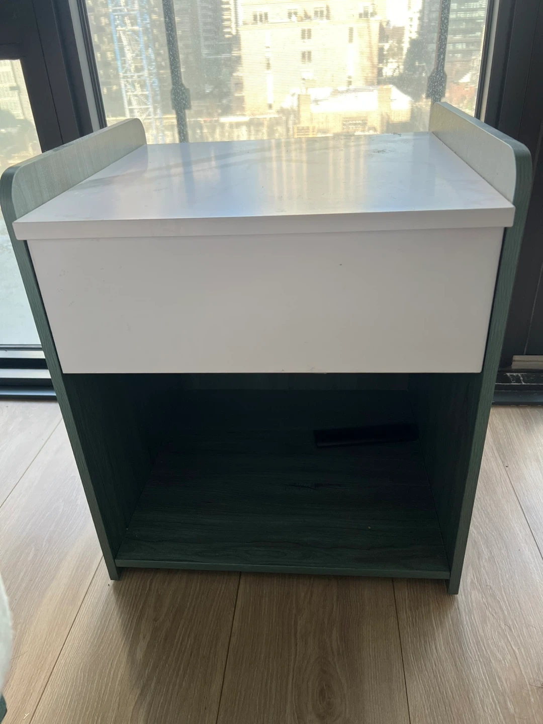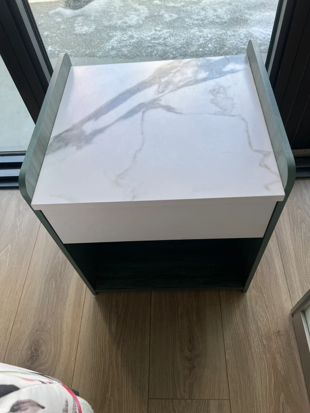 Selling a side table with a sleek marble top and a drawer! It features a drawer and an open shelf for storage. It's in great condition and would look great in any bedroom or living room