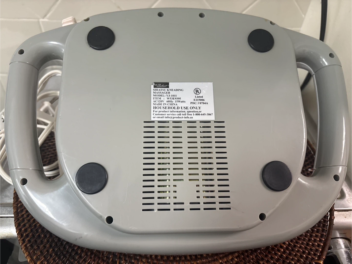 This Health Select kneading massager features a dual kneading action. It's designed for household use and has an AC120V, 60Hz, 15W power rating. The model is YZ-J11.