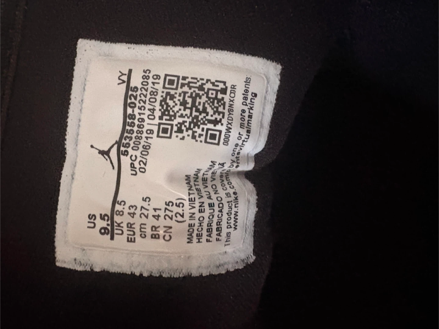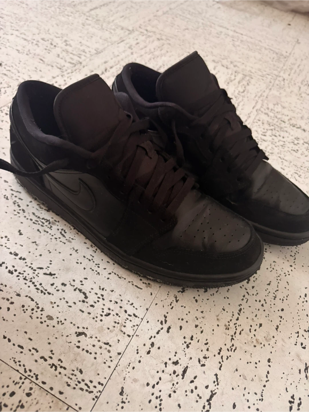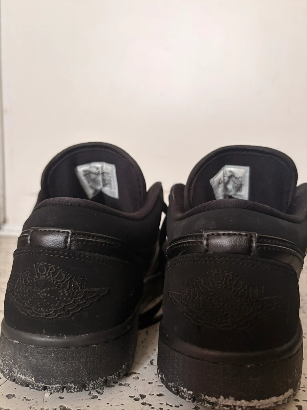 These are Air Jordan 1 Low sneakers in an all-black colourway. They're a size 9.5 US men's. Made in Vietnam.