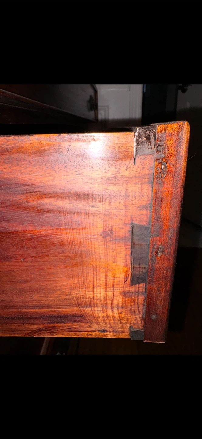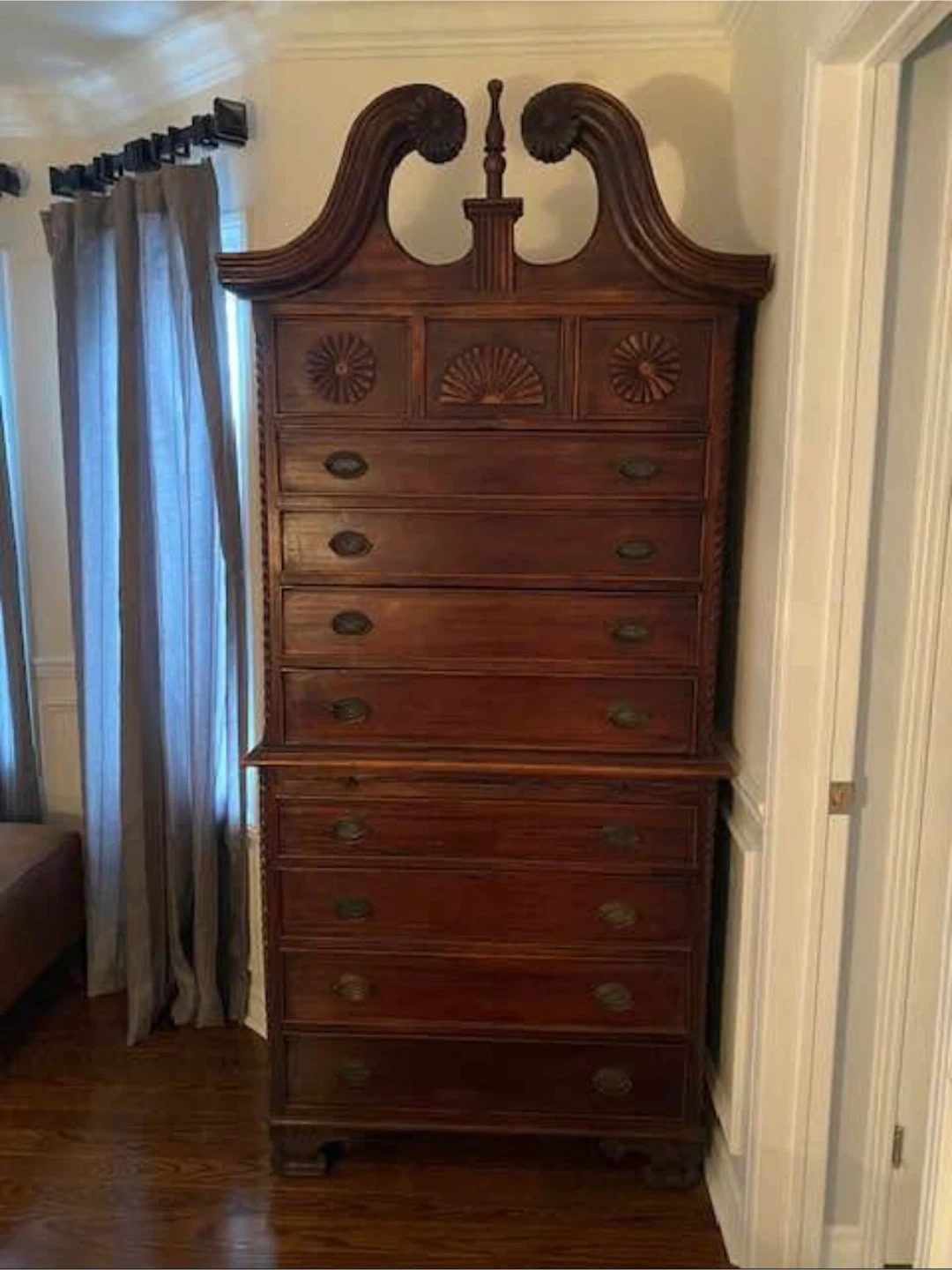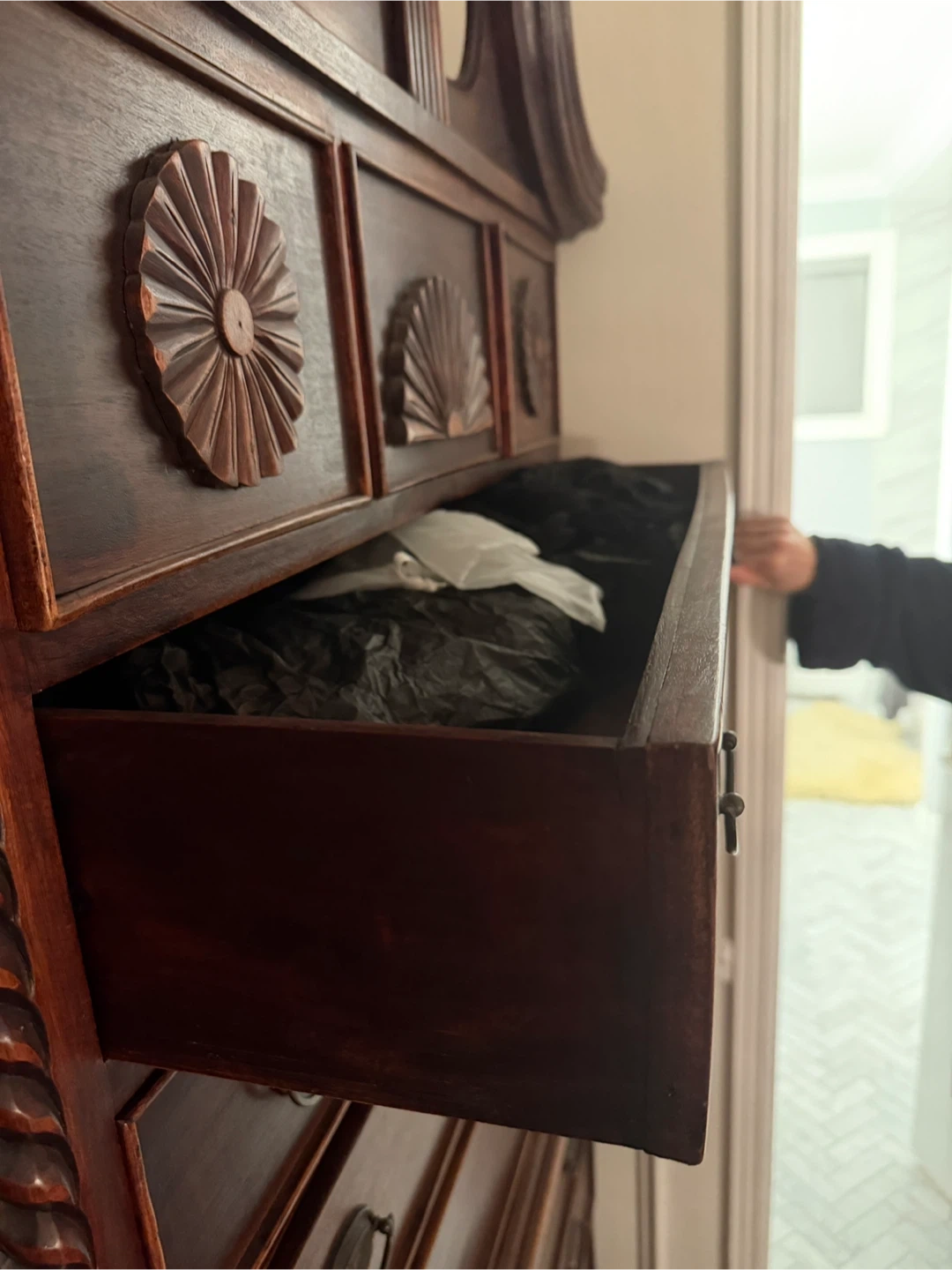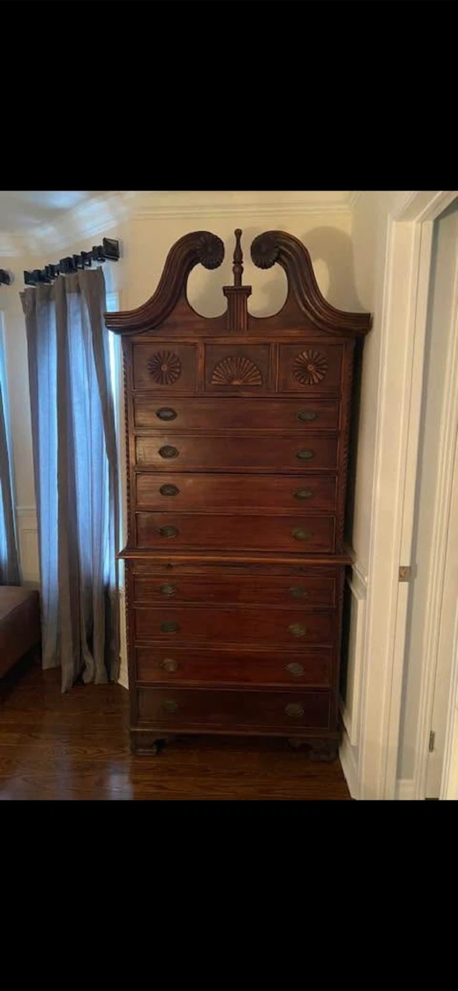 This striking vintage chest of drawers, also known as a tallboy, features a rich, dark wood finish and ornate detailing, offering both ample storage and a touch of classic elegance to any room. Its distinctive design and sturdy construction make it a standout piece. Being a used item, it has some signs of wear that add to its character and vintage charm.