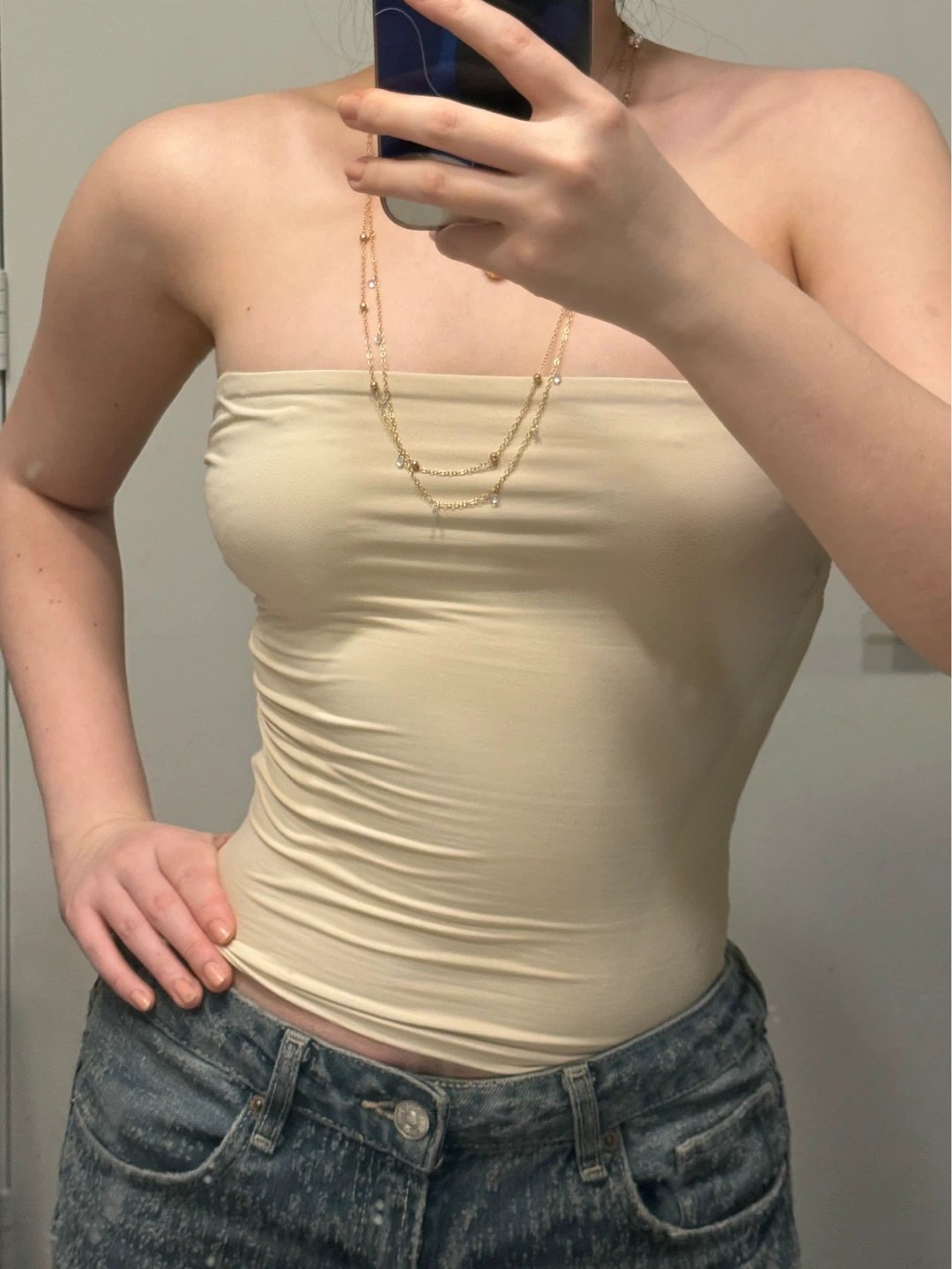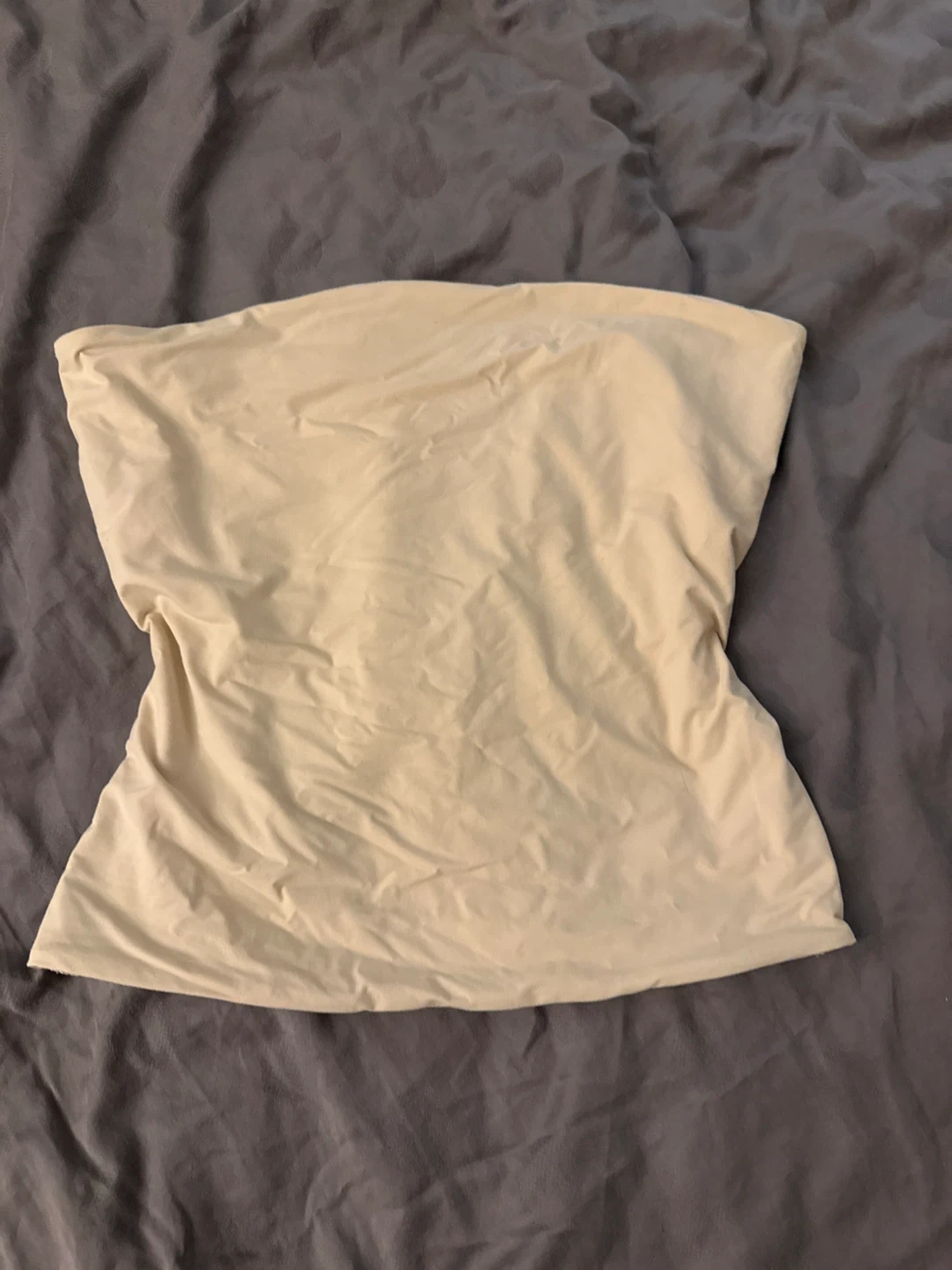 A very stretchy, seamless tube top in a light beige colour. It's designed for comfortable, everyday wear. This versatile piece is great on its own or layered under other clothing.