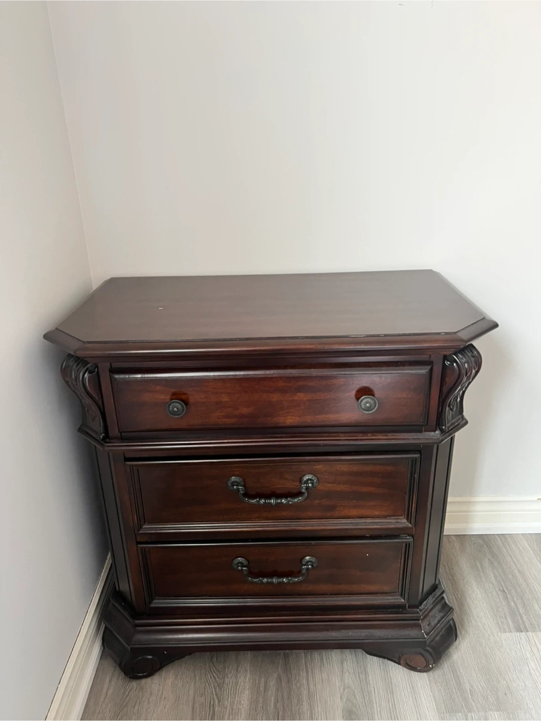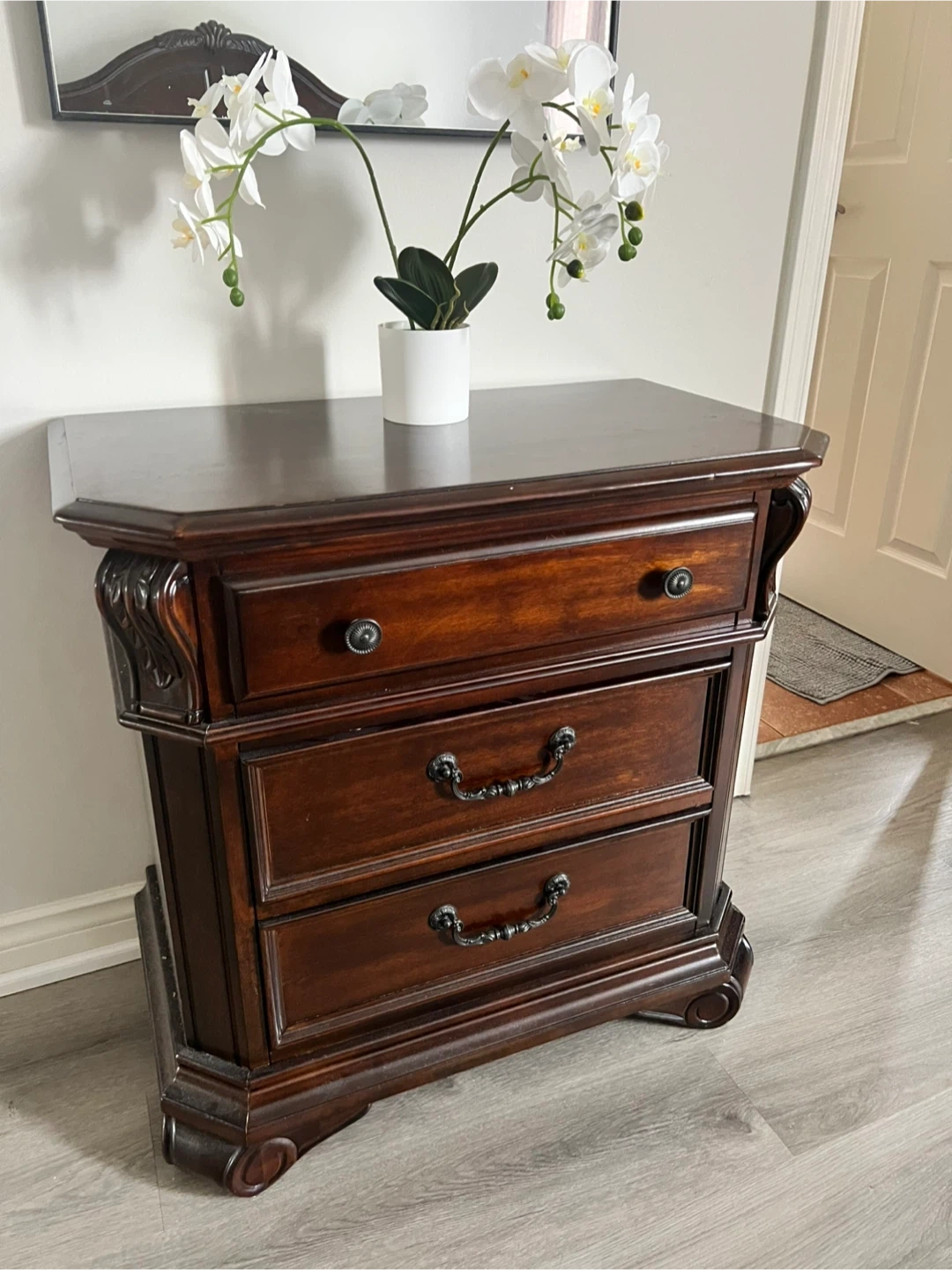 Classic dark wood nightstand featuring three drawers for storage. It has ornate carved details and metal drawer pulls. This piece adds a touch of elegance to any bedroom.