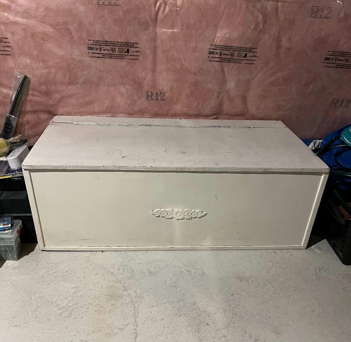 A vintage-style white wooden storage chest with a decorative front panel. It's great for storing blankets, toys, or seasonal items. The interior is lined with natural wood.