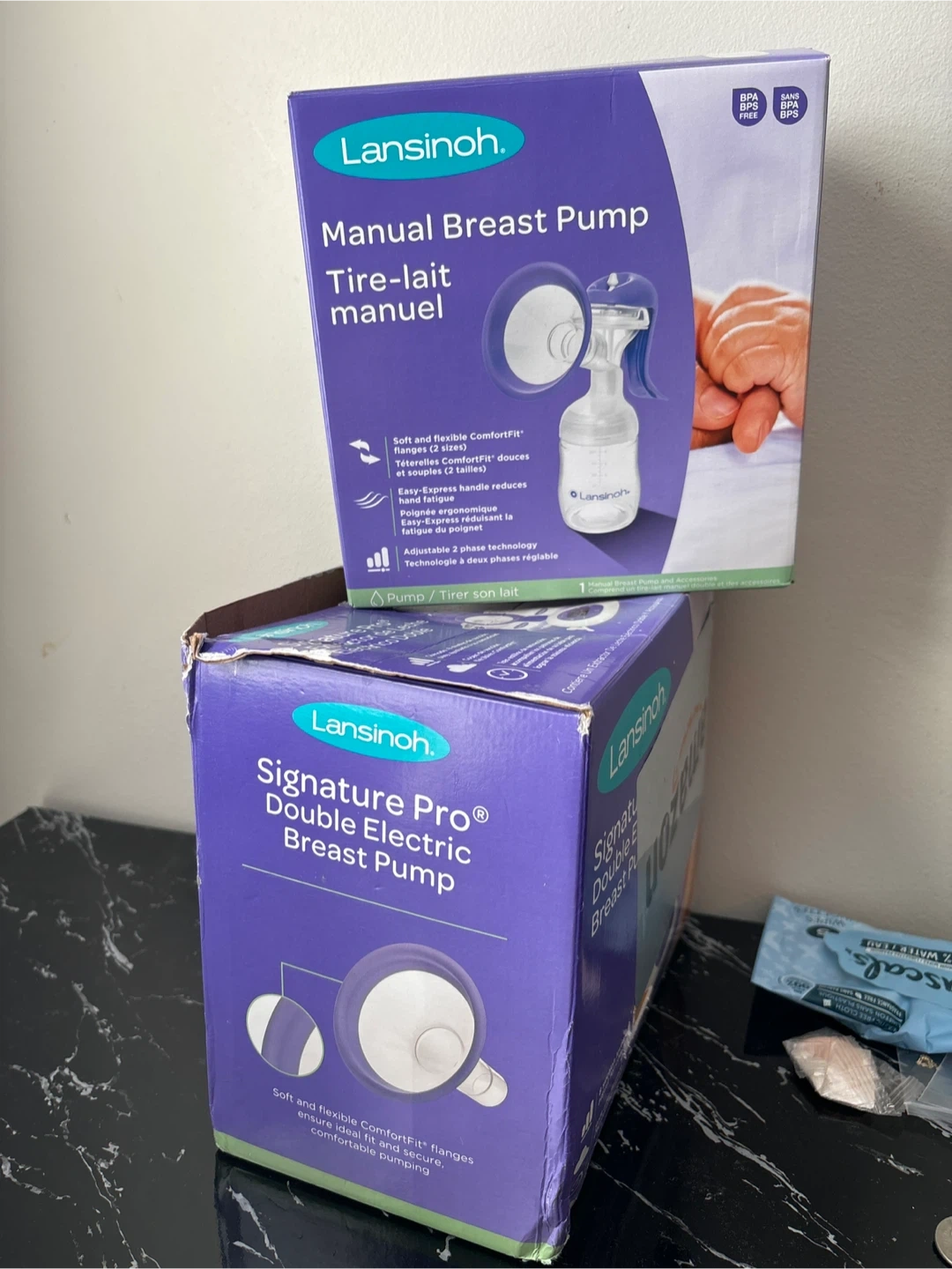 Selling two Lansinoh breast pumps: a manual and a Signature Pro Double Electric model. Both pumps feature ComfortFit flanges for a comfortable fit. The electric pump offers adjustable suction levels.