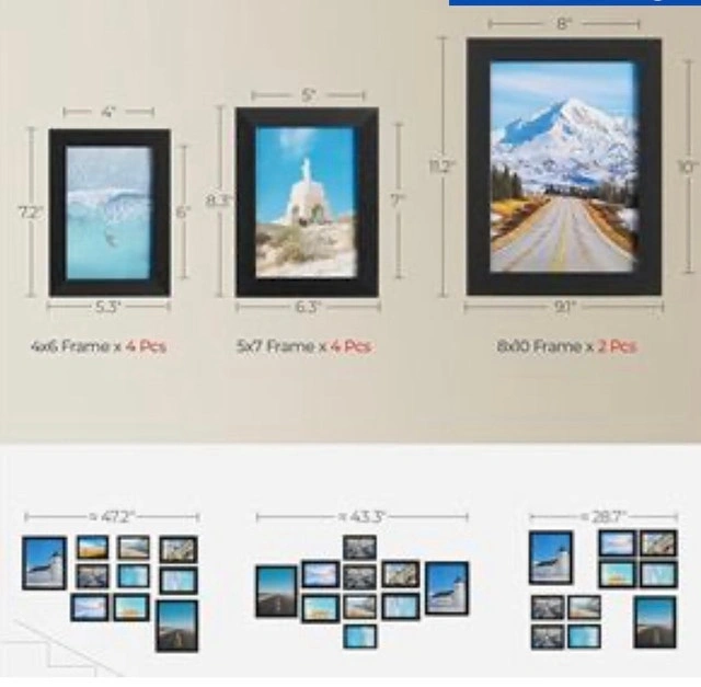 Complete black picture frame set for a gallery wall. Has 10 frames total. Comes with: 4 frames 4x6 inch, 4 frames 5x7 inch, and 2 frames 8x10 inch. Perfect for creating a cool photo display.