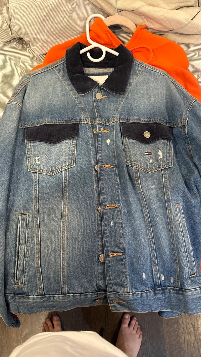 Tommy Hilfiger denim jacket with a colorblock design. Features corduroy accents on the jacket and pants. It’s a set
