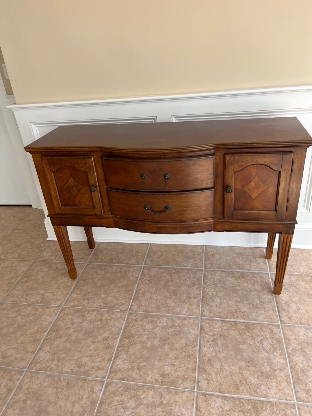 This is a beautiful vintage wooden buffet or sideboard. It features two drawers in the center and two cabinets on the sides for storage. The rich wood finish and decorative details add a touch of classic elegance to any dining room or living area. Its timeless design makes it a versatile piece for your home!