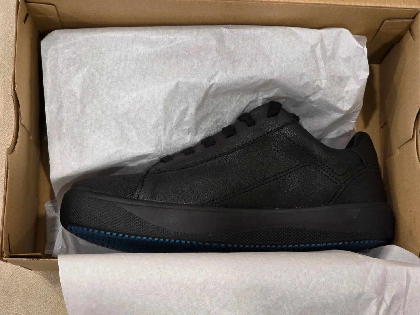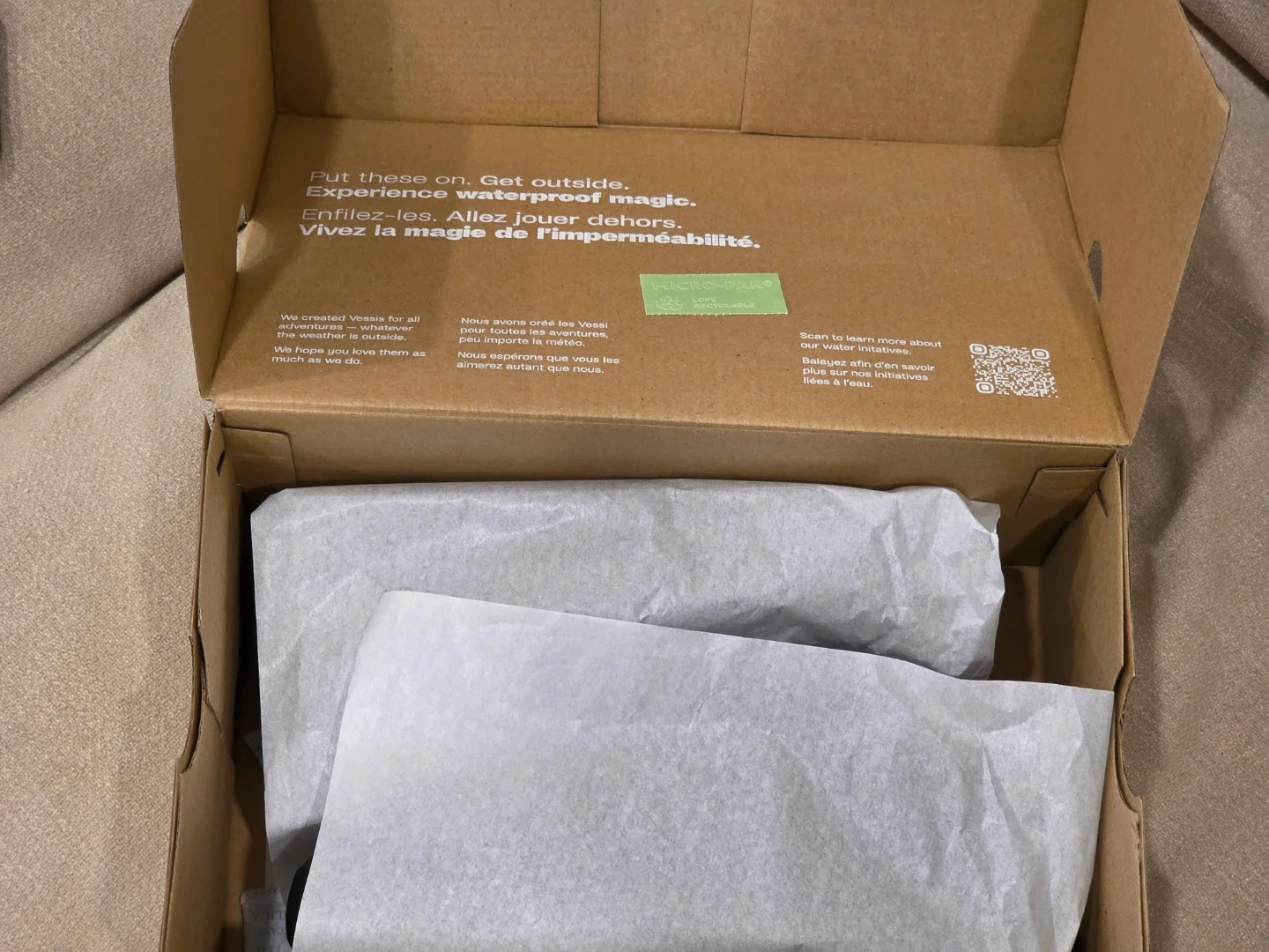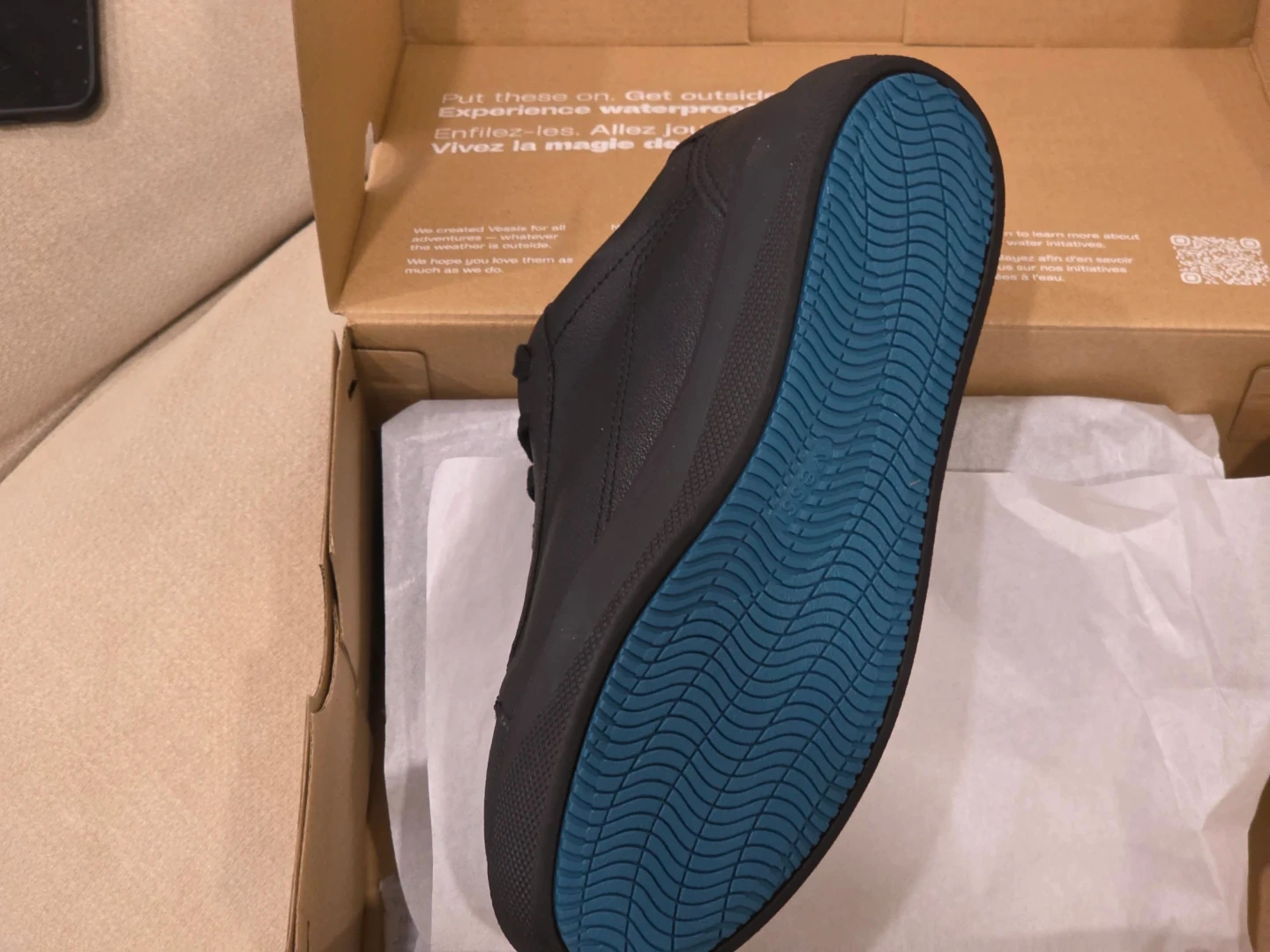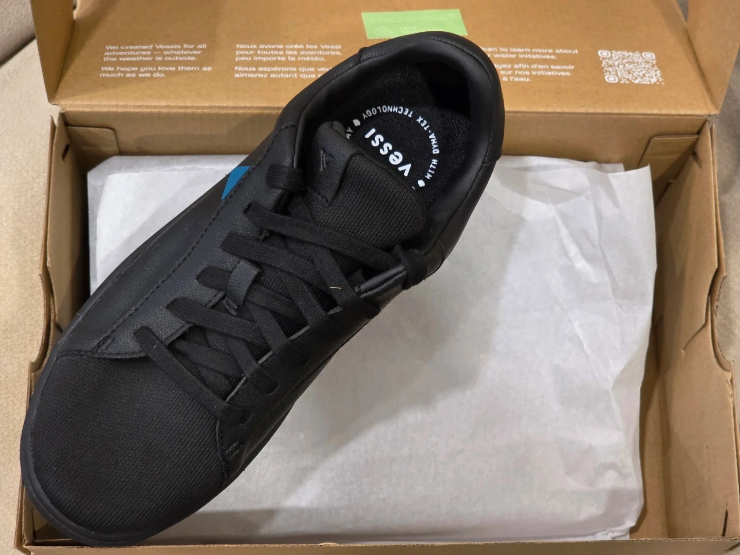 These are Vessi black waterproof shoes. They're designed for all adventures, keeping you dry no matter the weather. The shoes are made with DWR-treated natural rubber and a unique HydroTeka technology for breathability. The soles have a distinctive blue wave pattern for grip.