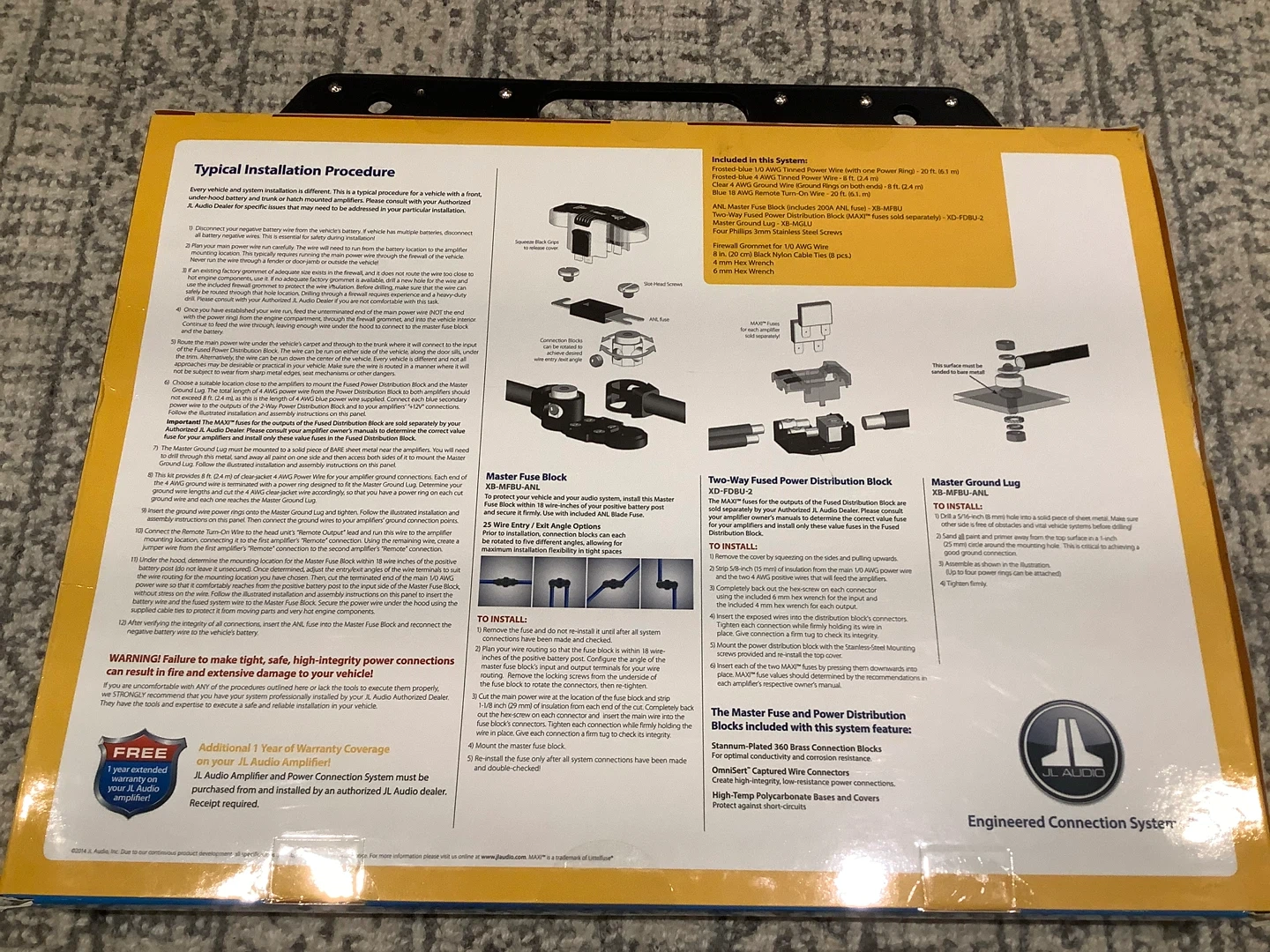 This JL Audio amplifier power connection system is designed for your car audio setup. It includes 1/0 AWG wire for reliable power delivery. A master fuse block with 200A fuse is included for optimal system protection. It's perfect for powering multiple amplifiers.