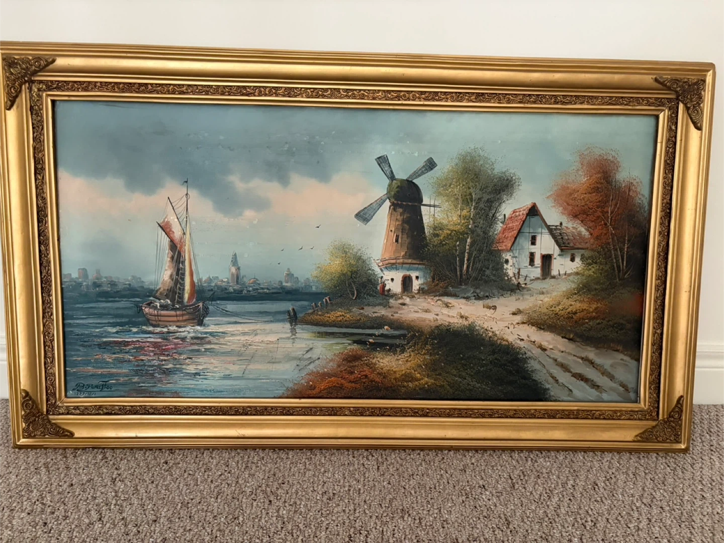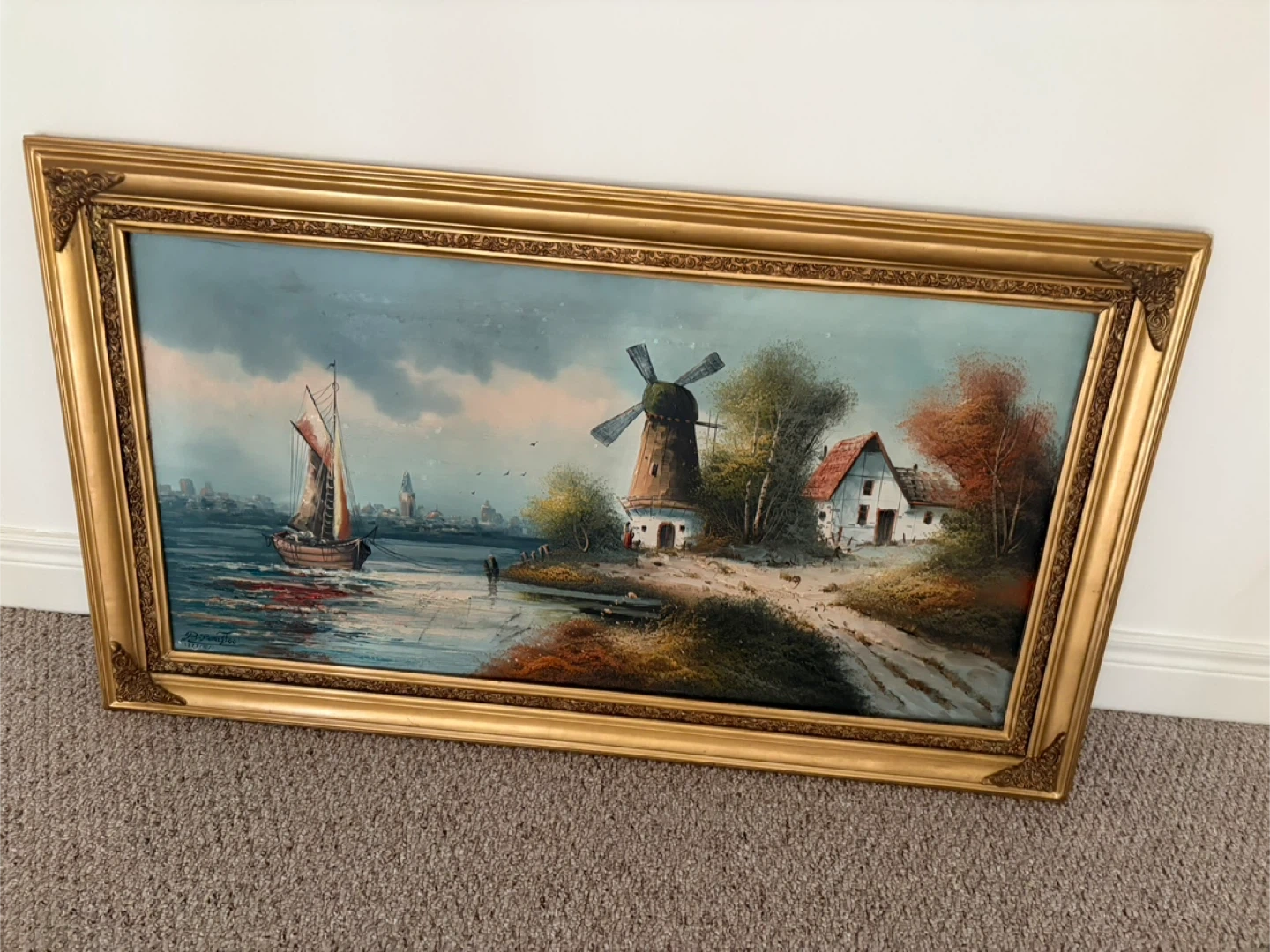 Vintage hand painted oil painting depicting a sailboat and windmill. This artwork comes with a decorative gold frame. It will add a touch of classic art to any room!