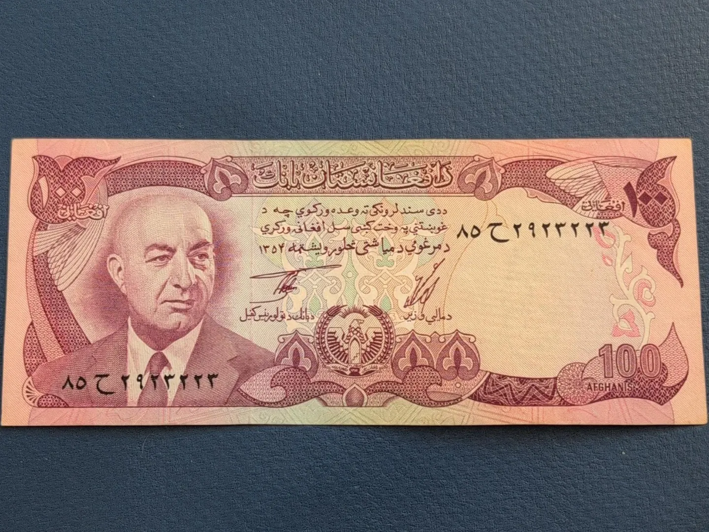 This is a 100 Afghanis banknote from Afghanistan. It features a portrait on the obverse and a building on the reverse. The year 1352 is visible on the front.
