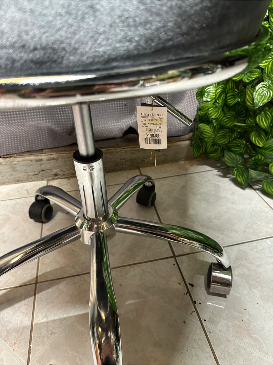 This office chair features a plush grey velvet upholstery with a comfortable curved backrest and chrome armrests.