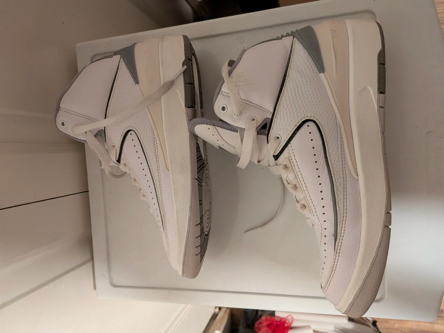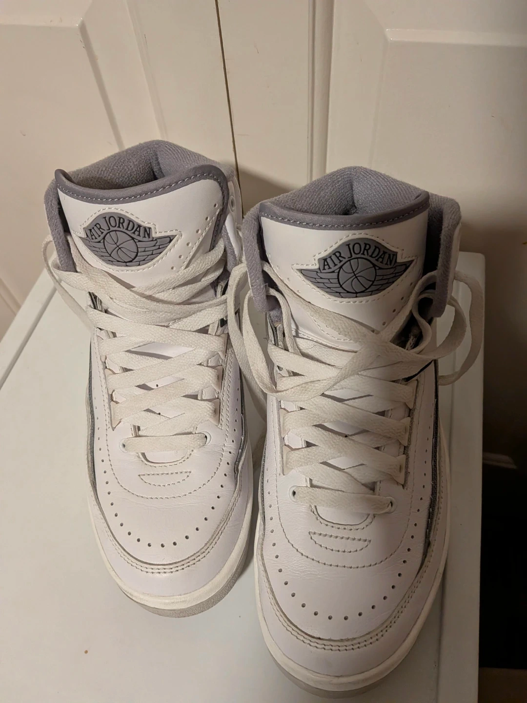 These Air Jordan 2 Retro sneakers are white with grey accents. They feature a classic high-top design and lace-up closure. Leather upper.