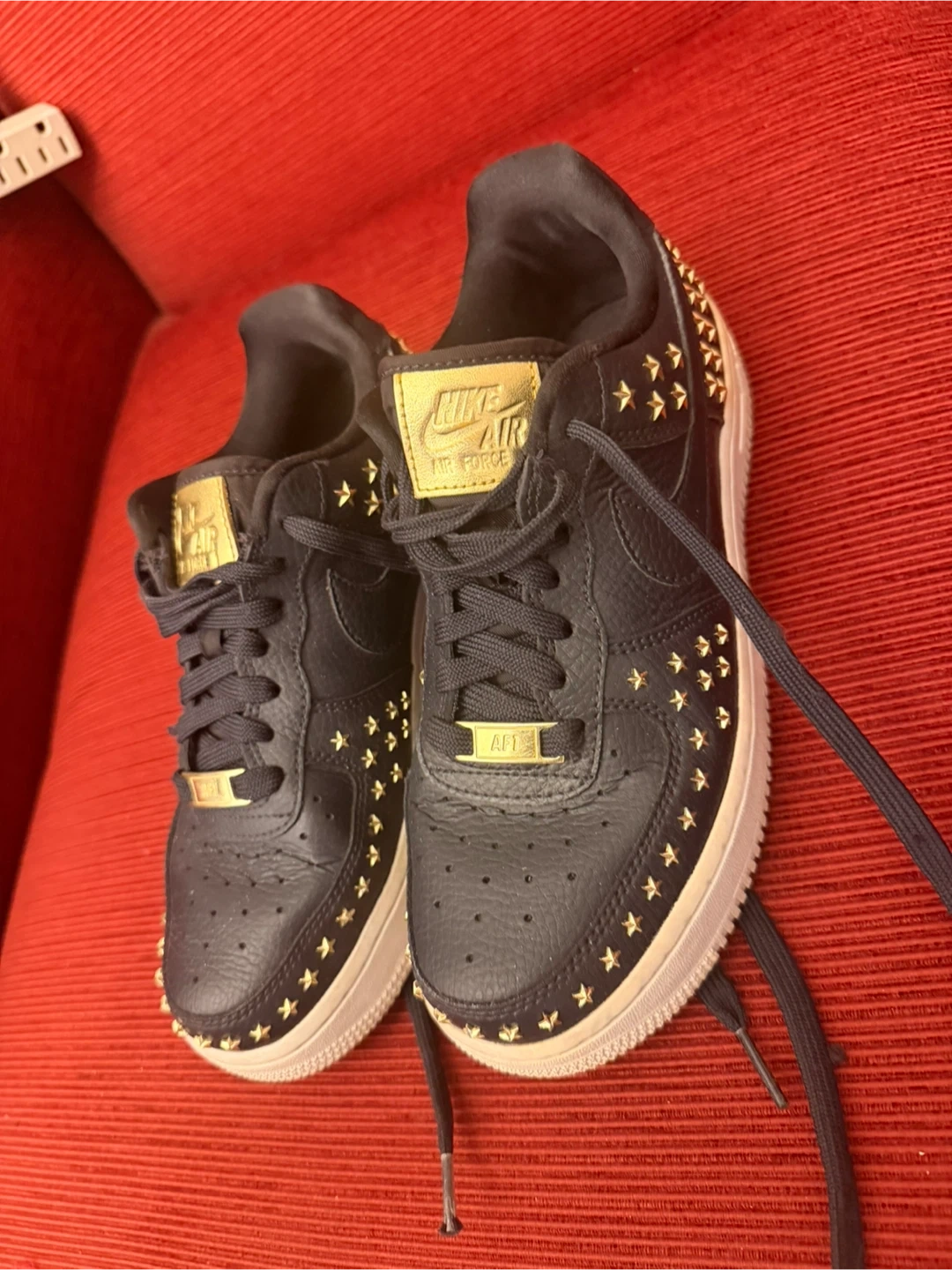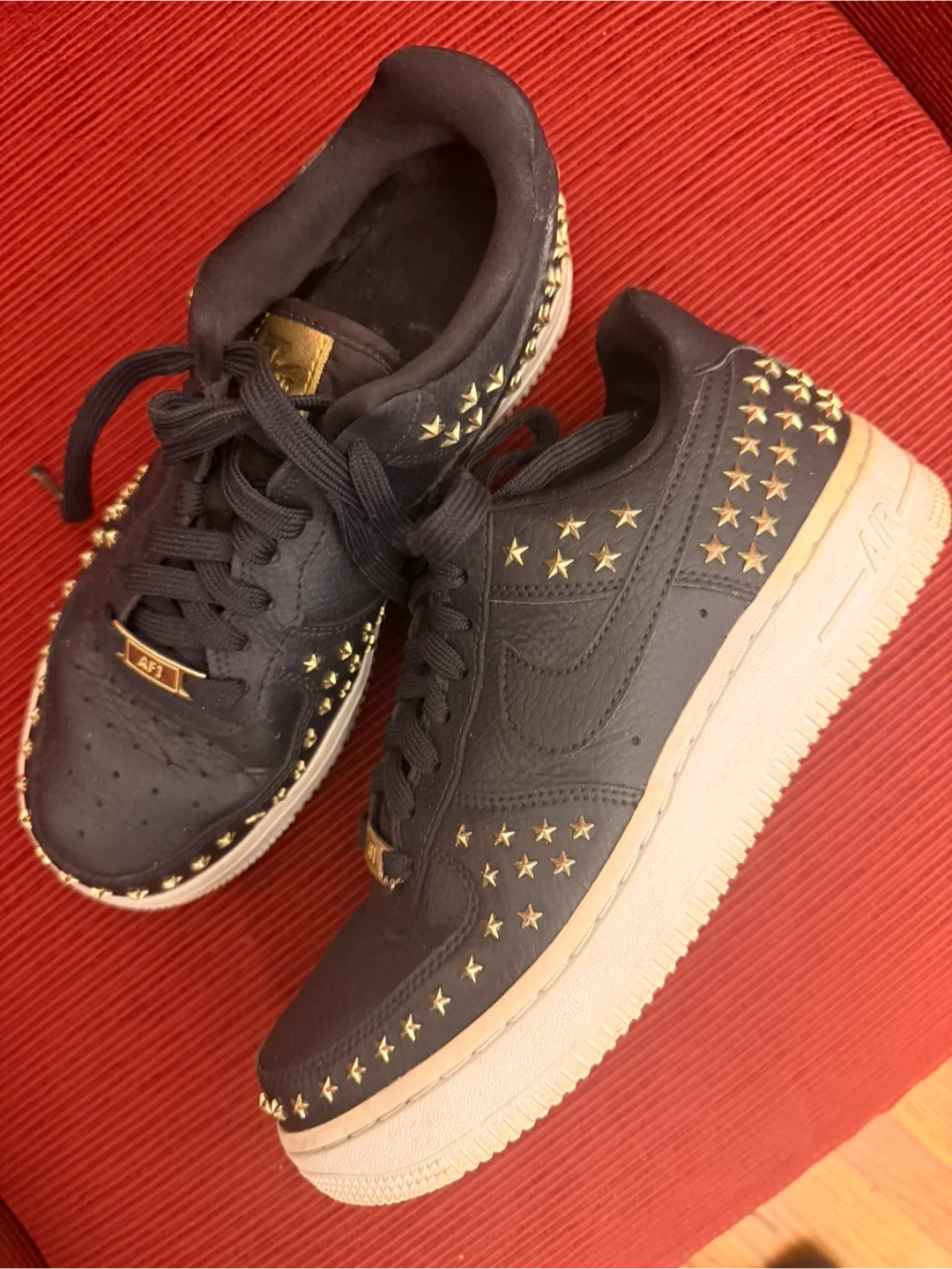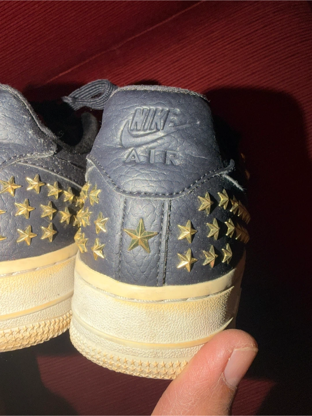 These Nike Air Force 1 sneakers feature a navy blue leather upper with gold star studs around the sole and toe box. The insoles and tongue branding are gold.