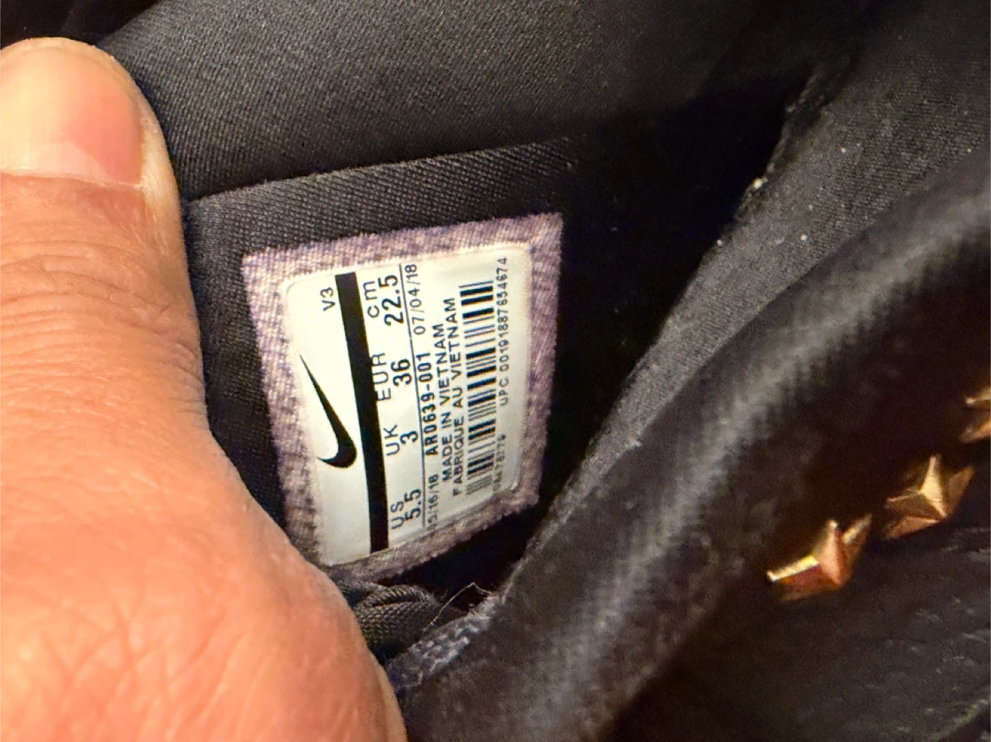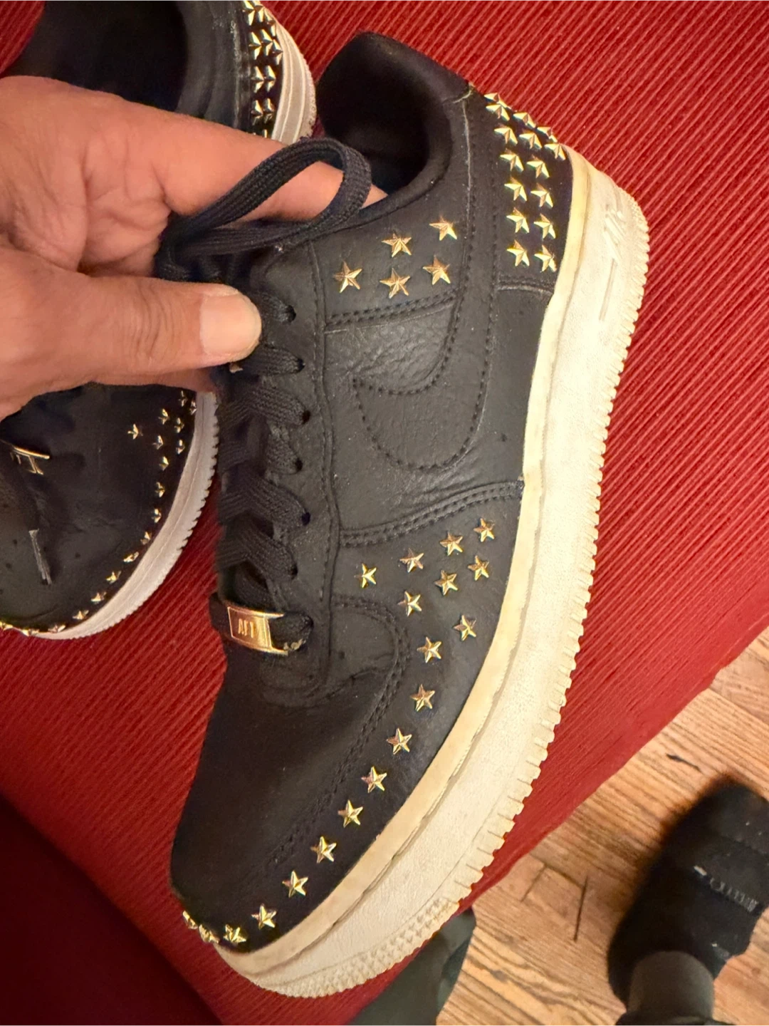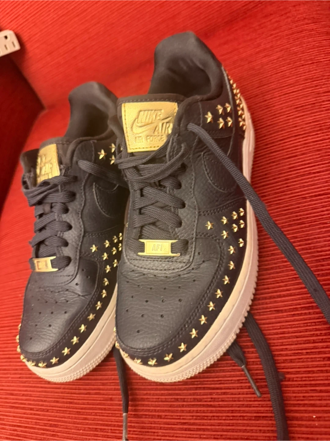These Nike Air Force 1 sneakers feature a navy blue leather upper with gold star studs around the sole and toe box. The insoles and tongue branding are gold.