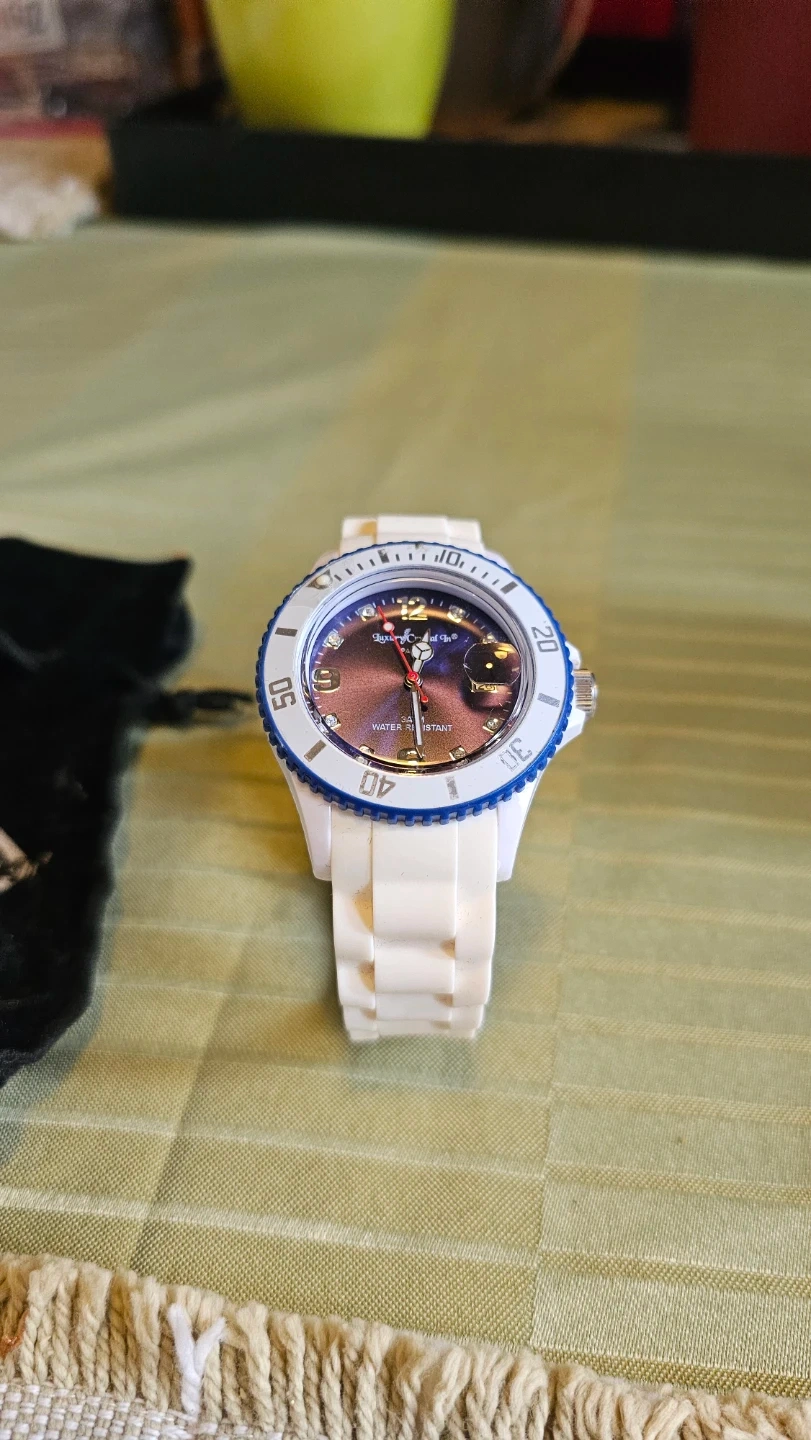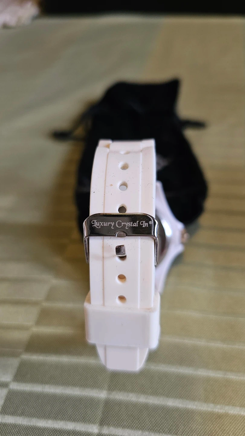 Selling a brand new Luxury Crystal In watch with a white silicone strap and blue bezel. Made in Paris.