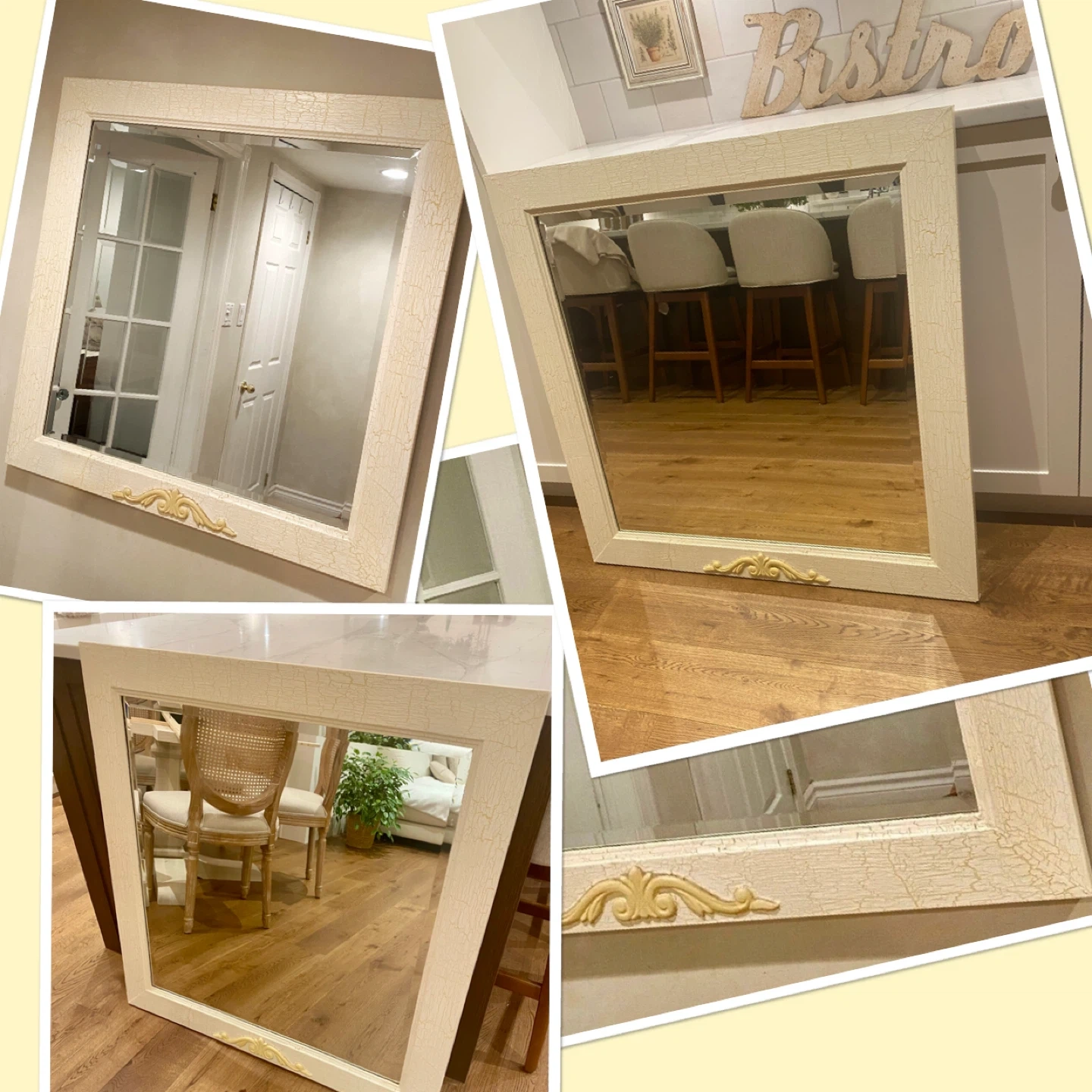 GORGEOUS Very Large beveled mirror designer painted /antiqued in a crackle finish in a beautiful cream and soft yellow.