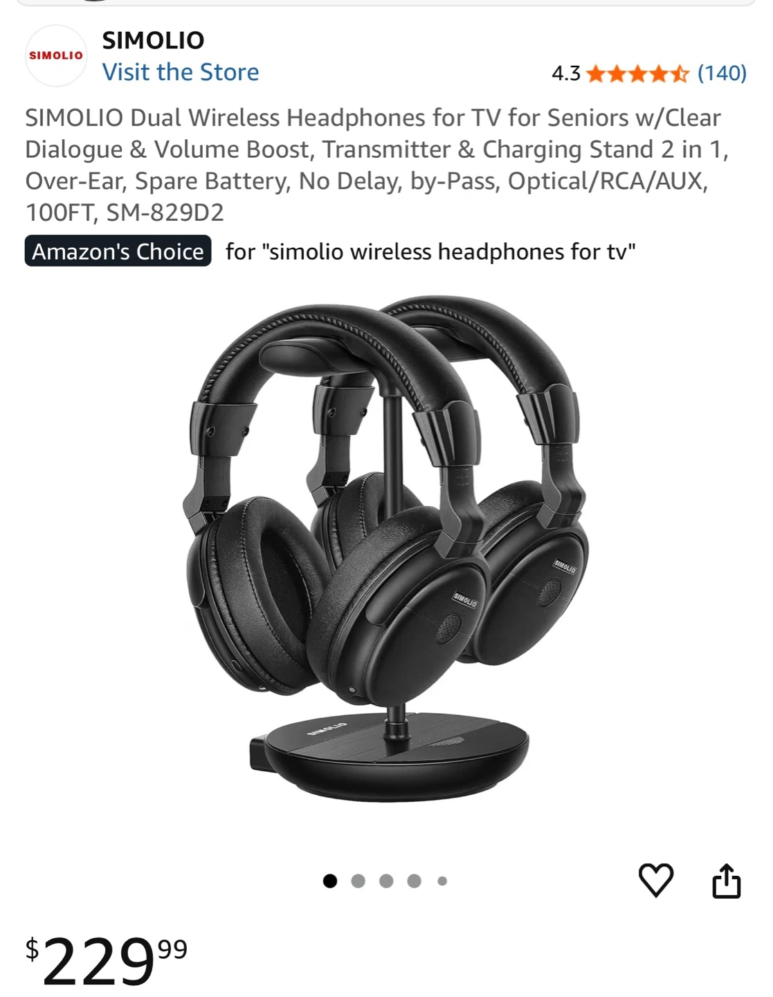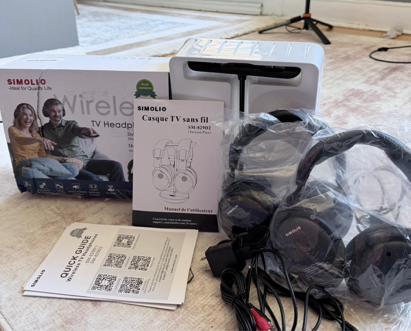 SIMOLIO dual wireless TV headphones for seniors. Includes transmitter and charging stand. Over-ear design with spare battery. 100ft range. SM-829D2 model.