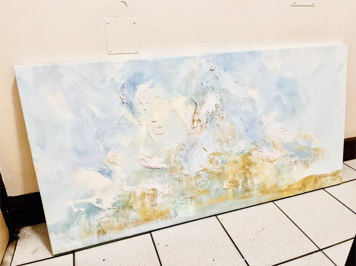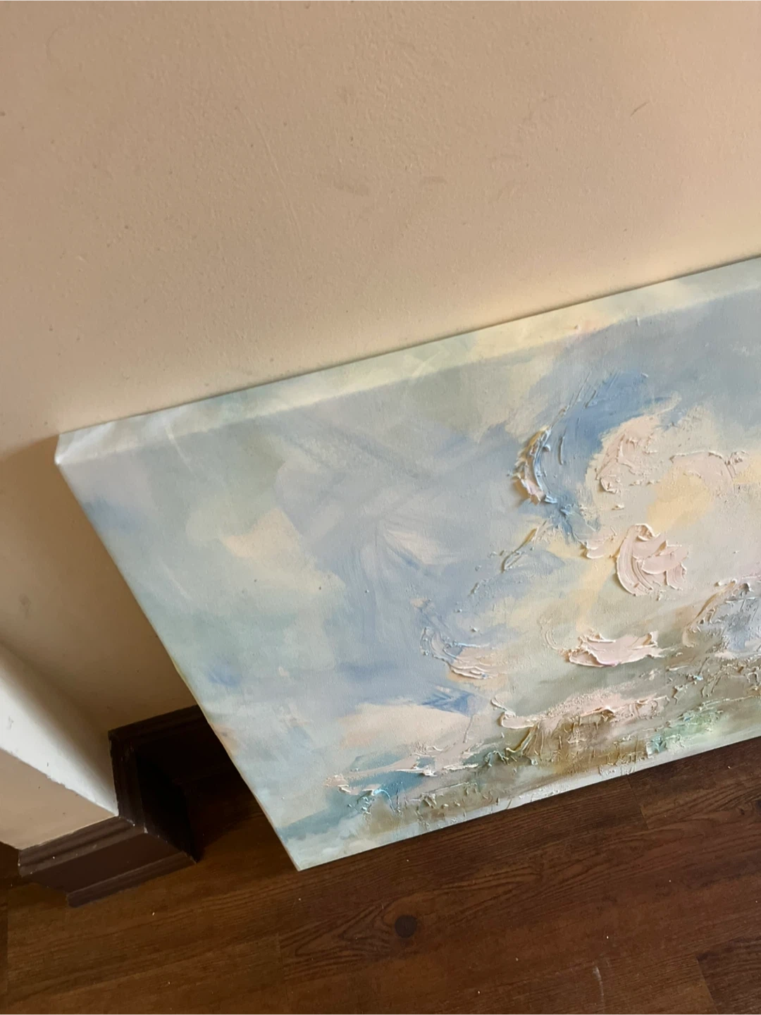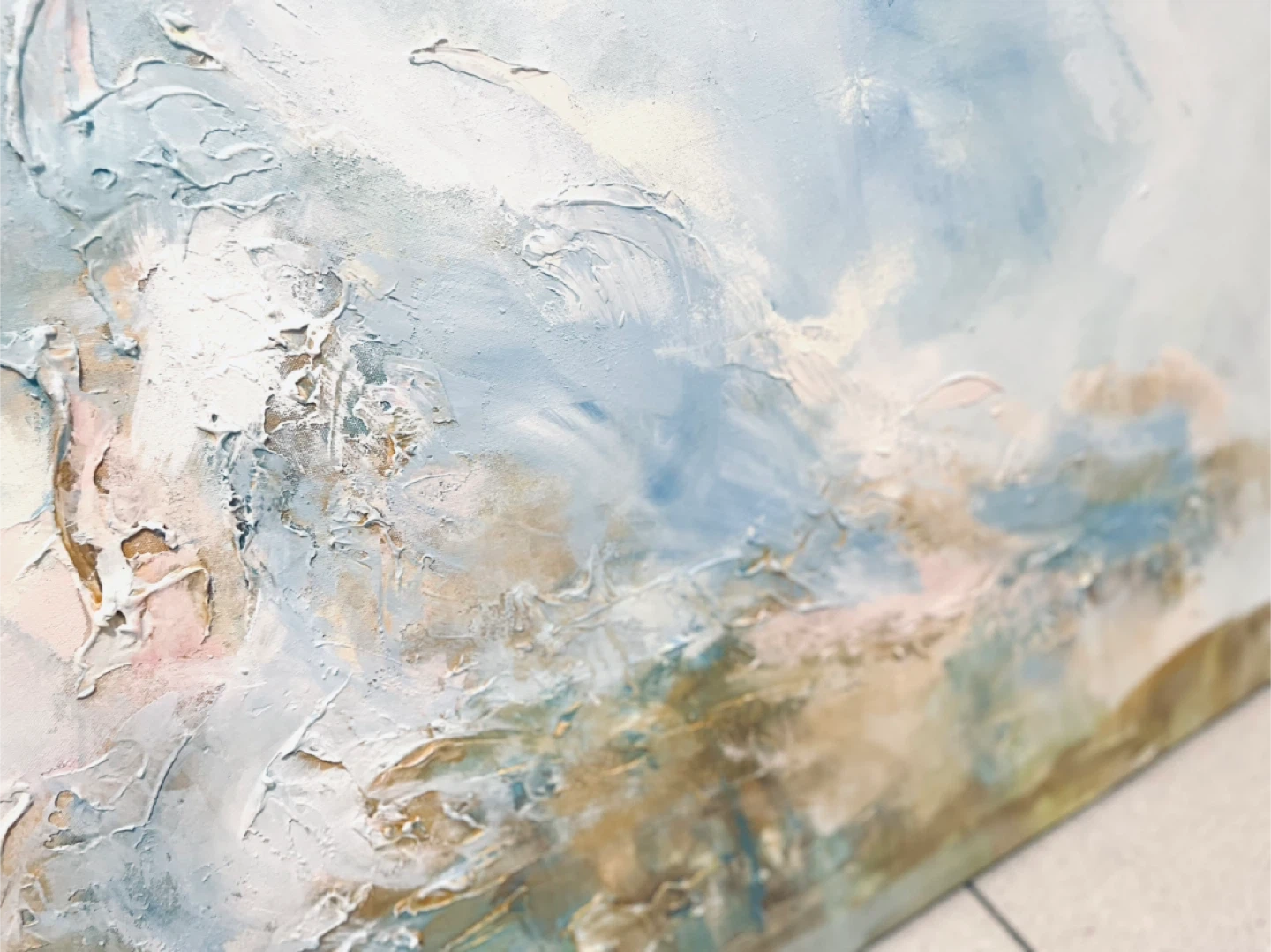 This is a textured abstract landscape painting on canvas. It is an original not a print. It features soft blues, yellows, and white with hints of pink and hints of gold. The impasto technique creates a lot of depth and visual interest. It's a statement piece for any room!
