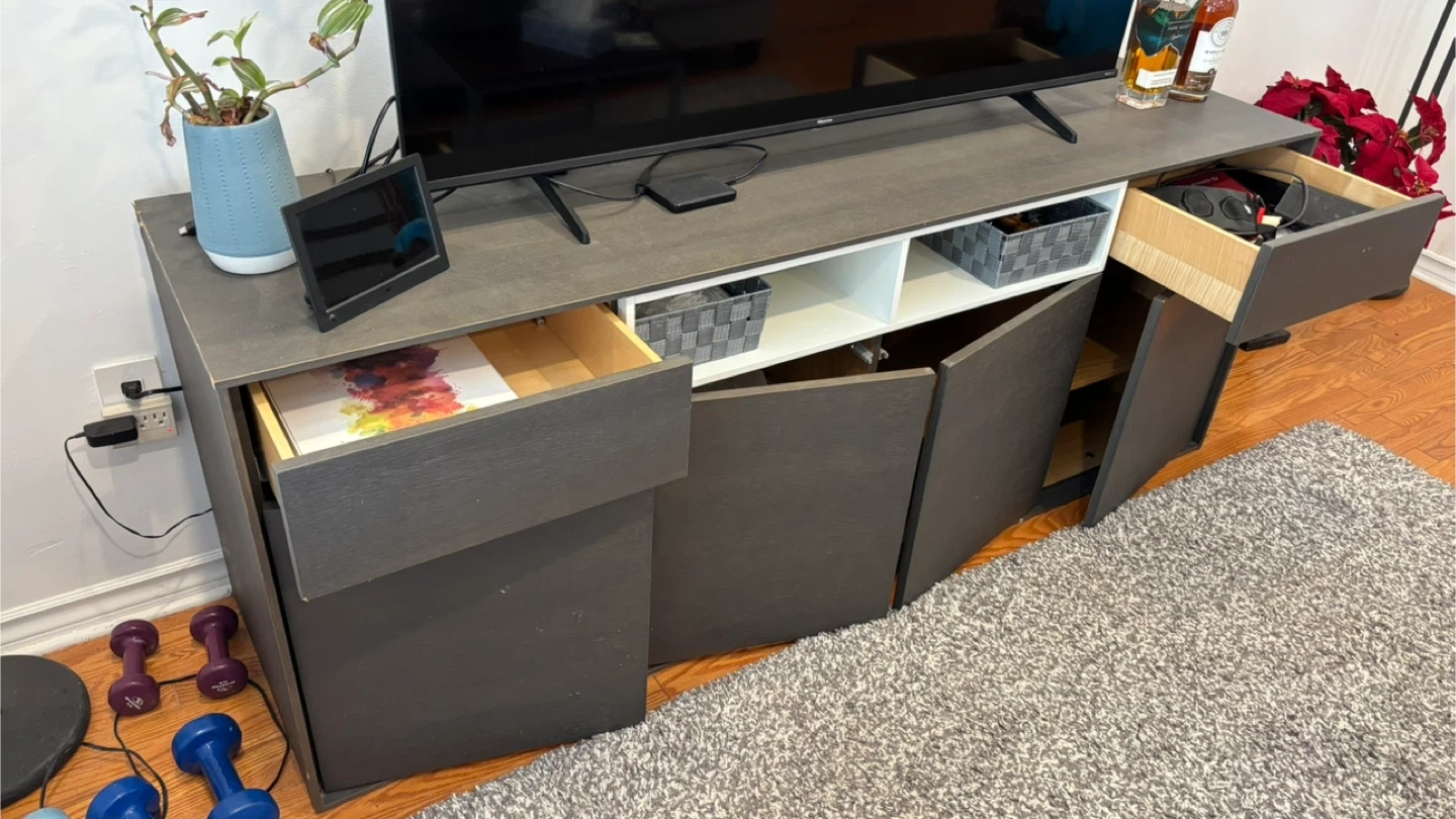 Dark wood (Grey) TV stand featuring multiple storage compartments. It includes two cabinets with doors and two drawers, along with open shelving areas.