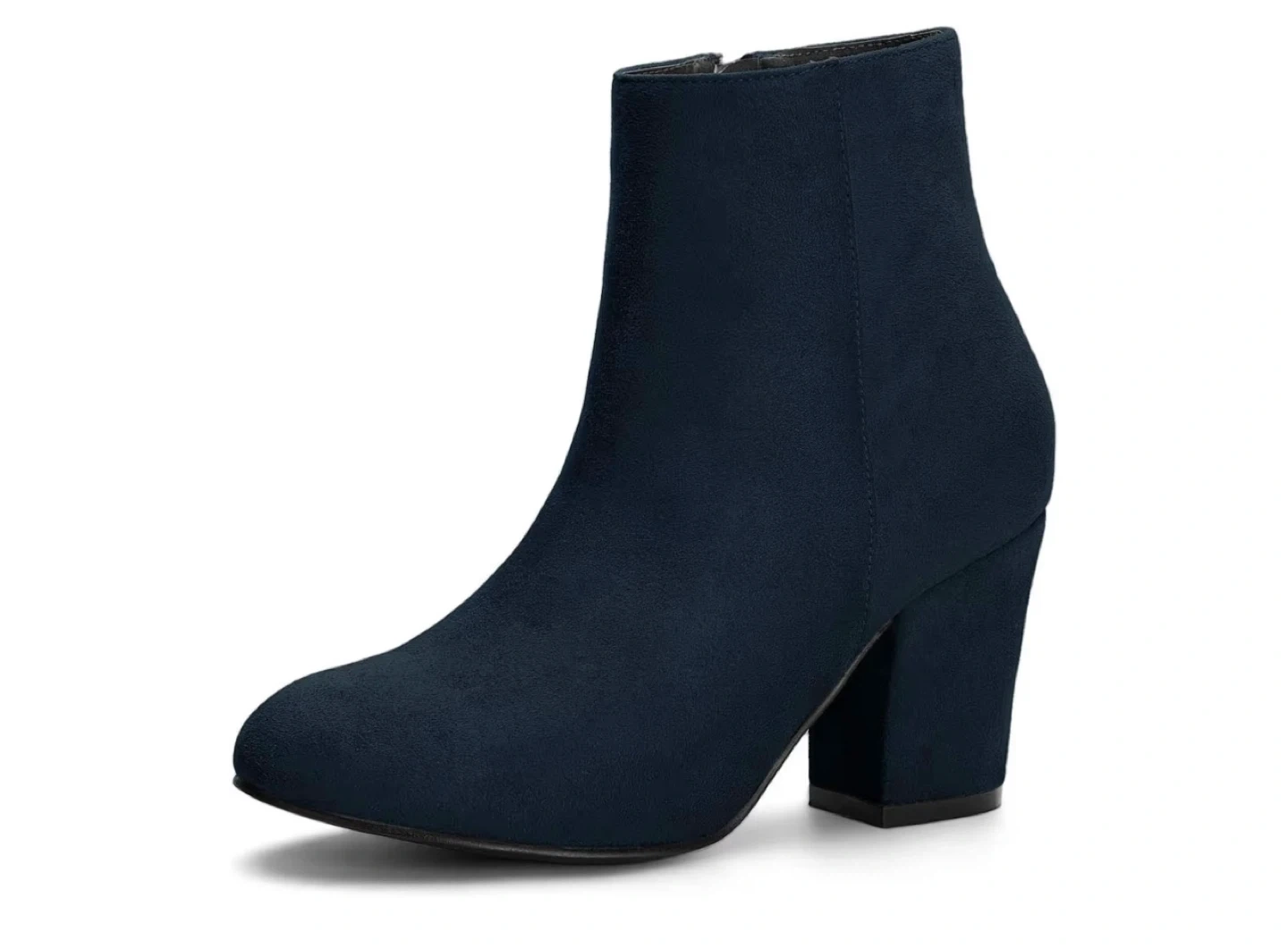 These stylish navy blue ankle boots feature a chic block heel and a smooth suede finish. They have a convenient side zipper for easy on and off. This versatile pair is perfect for dressing up any outfit for a night out or a day in the city!