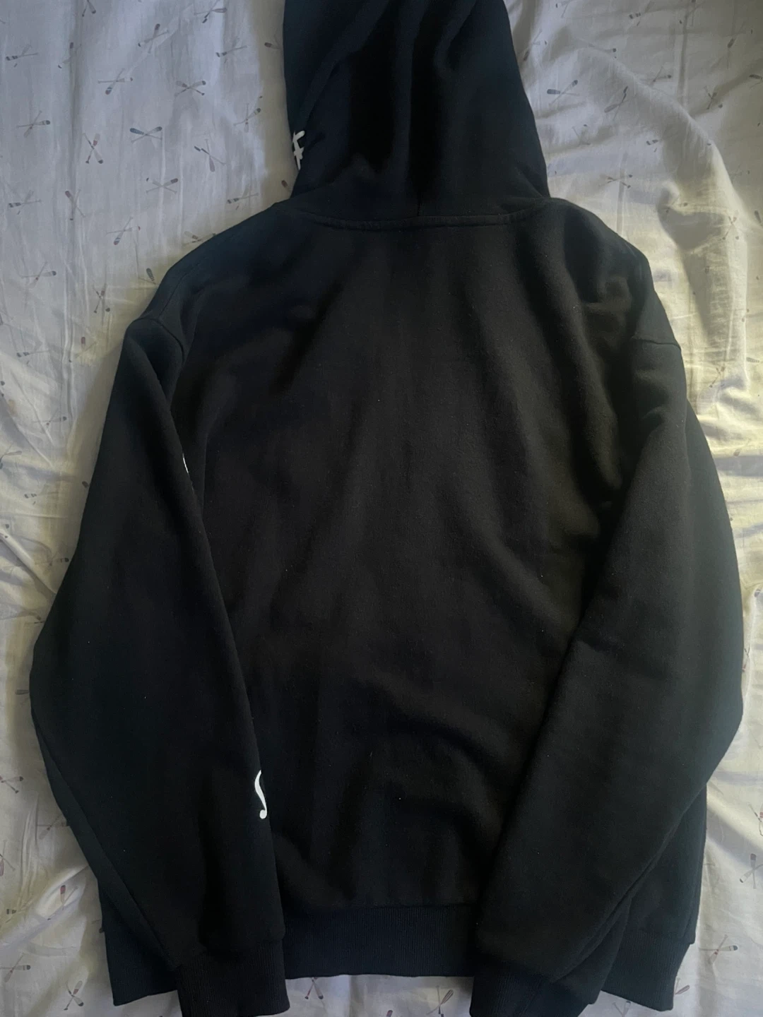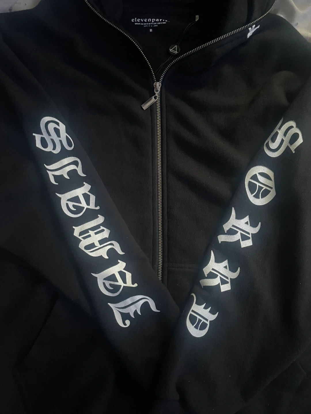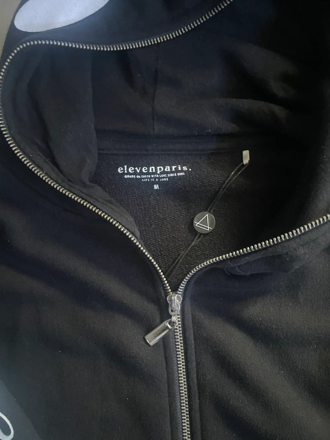 Selling a black Eleven Paris full zip up hoodie I got while in Paris it’s in men’s size medium. It's in great condition and features a unique design on the sleeves and hood.